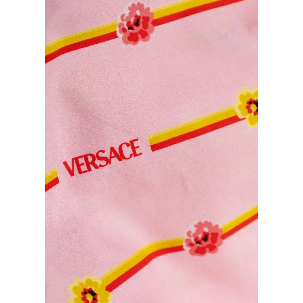 Ontdek de betoverende wereld van kindermode met ROZE SHORTS met een bloemmotief van het prestigieuze merk VERSACE KIDS. Deze charmante shorts trekken de aandacht met hun levendige roze kleur, versierd met een subtiel patroon van horizontale strepen in rood en gele tinten, waardoor de delicate bloemen in verschillende tinten worden versterkt. Een zachte