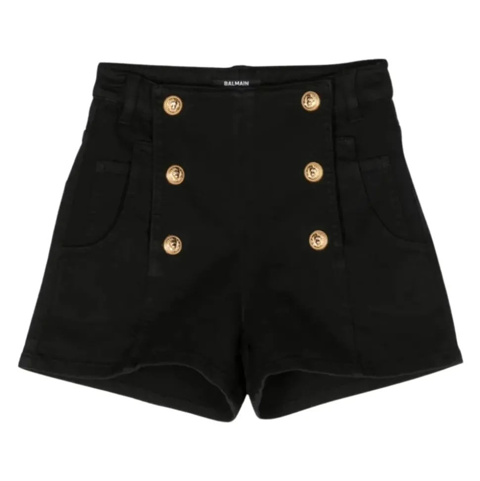 De Balmain shorts met hoge taille combineren een getailleerd silhouet met kenmerkende goudkleurige knopen met reliëf en praktische zakken voor dagelijks gebruik. Belangrijkste kenmerken: Zwart | Nera | Katoen | Drukknoopsluiting aan de zijkant | Twee steekzakken | Twee paspelzakken achter | Goudkleurige knopen met reliëf aan de voorkant | Lengte tot op het bovenbeen | Rechte zoom | Logopatch op de achterkant | Afmetingen en pasvorm: Hoge taille | Lengte tot op het bovenbeen | Samenstelling en onderhoud: 92% katoen | 6% modal | 2% elastaan