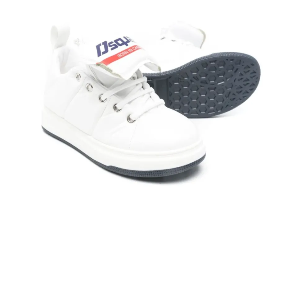 Dsquared2 Sneakers — witte sneakers van kalfsleer met een vetersluiting aan de voorkant en een oversized tong, ontworpen voor een moderne, alledaagse look. Belangrijkste kenmerken: Wit | Kalfsleer | Rubberen zool voor grip | Vetersluiting | Hiellus | Wit logo | Oversized tong | Rubberen zool | Samenstelling & onderhoud: Buitenkant: 100% kalfsleer | Zool: 100% rubber | Voering: 100% stof | Afnemen met een vochtige doek. Niet in de wasmachine. Leder spaarzaam behandelen en uit de buurt van directe hitte houden.
