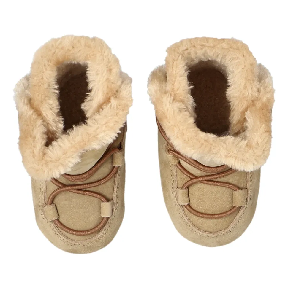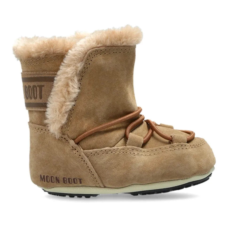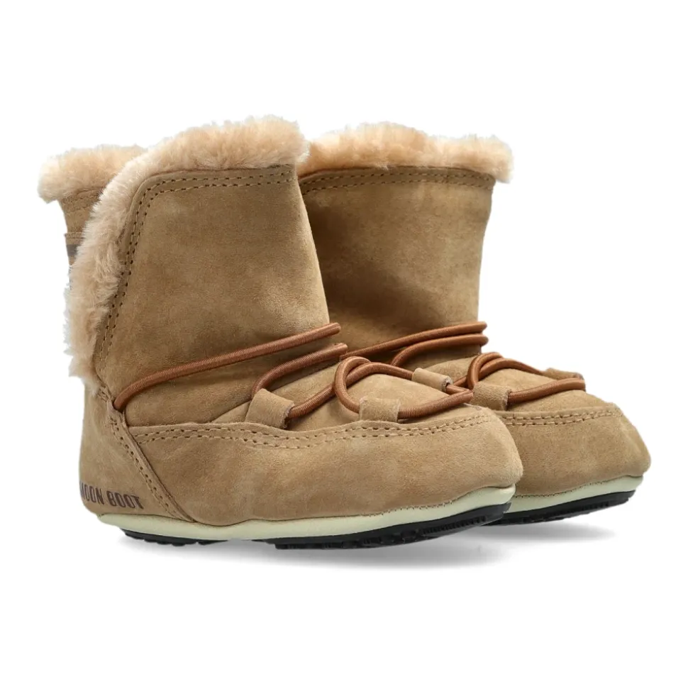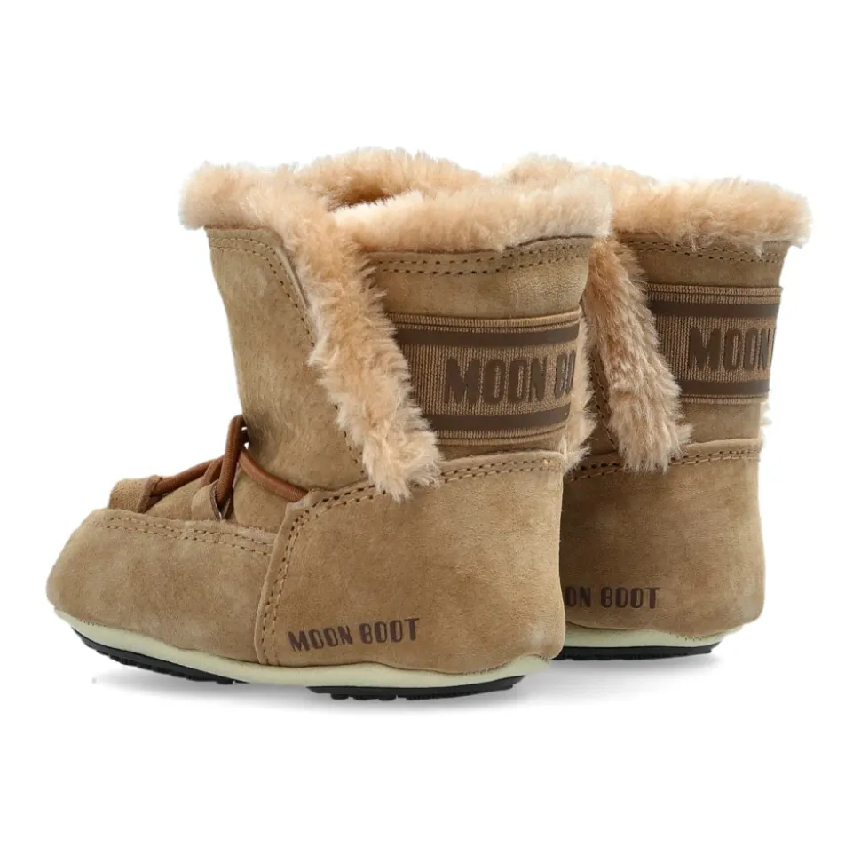 MOON BOOT KIDS ‘CRIB’ SNEEUWLAARZEN zijn een verfijnde keuze voor veeleisende ouders en hun kleintjes. Gepresenteerd in een tijdloze silhouet, maken ze indruk met hun MINIMALISTISCH ONTWERP – de uniforme beige kleur gemaakt van zacht suède harmonieert perfect met de pluche nepbont rand, die kindervoeten omhult in gezellige warmte. De middelhoge schacht omarmt voorzichtig de enkel en zorgt voor effectieve bescherming tegen de kou. Details zoals het INGEDEUKTE MOON BOOT LOGO in een contrasterende kleur en subtiele vetersluiting benadrukken het unieke karakter van dit schoeisel. De geïsoleerde voering, vochtbestendigheid en zorgvuldig ontworpen rubberen zool maken ze de perfecte metgezel voor winterse avonturen. WAAROM ZOU U DIT PRODUCT MOETEN KIEZEN? * Uitzonderlijke combinatie van comfort en bescherming tegen de kou * Elegant, tijdloos ontwerp * , waterdichte materialen * Uitstekend vakmanschap van Moon Boot * Perfecte pasvorm en gemakkelijk aan te trekken Zoolhoogte: 0,5 cm