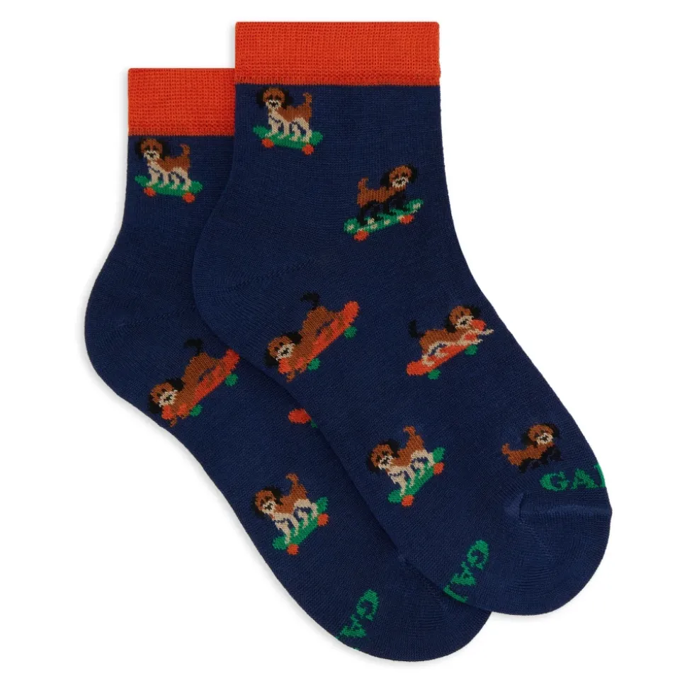 Korte kindersokken gemaakt in Italië. Effen blauwe kleur met kleine geborduurde honden en een band in verschillende kleuren. Het geborduurde Gallo-merklogo op de teen zorgt voor contrast.