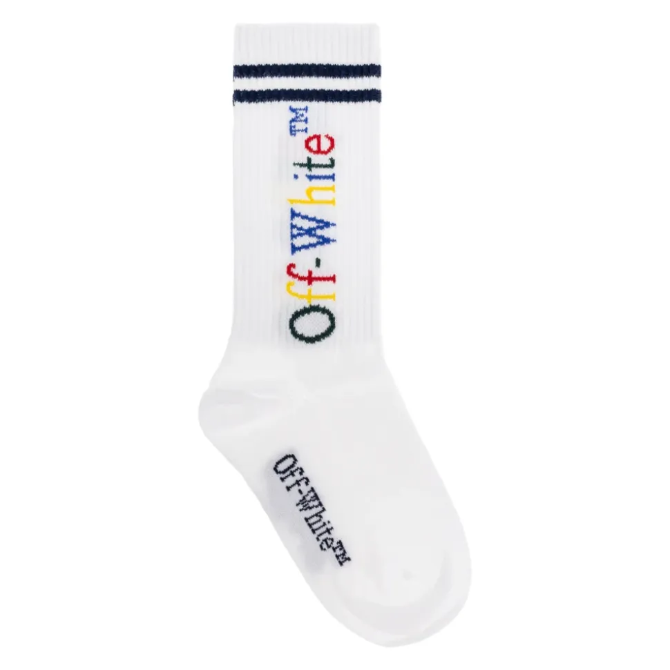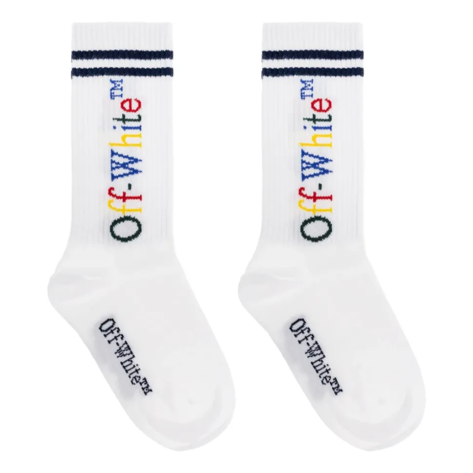 OFF-WHITE™ LOGO SOKKEN zijn een uiting van finesse verborgen in een alledaags detail. Hun klassieke, langere bemanningstijl met duidelijk gemarkeerde hielen en tenen garandeert verfijnd draagcomfort. Het dominante WIT wordt aangevuld met twee horizontale marineblauwe strepen, kenmerkend voor een sportieve esthetiek. De duidelijk geribbelde stof omhult zachtjes de voet en zorgt voor flexibiliteit en een uitstekende pasvorm. De discrete glans van de naam van de maker in de vorm van een verticaal geplaatst “Off-White™” embleem – met elk letter in een andere tint – trekt zeker de aandacht en benadrukt het unieke karakter van het product. Daarnaast is er een horizontale, contrasterende zwarte merkinscriptie op de voet. WAAROM DIT PRODUCT KIEZEN? * Een exclusieve optie voor de jongste designliefhebbers * Onderscheidende geribbelde structuur voor comfort en duurzaamheid * Nauwgezet vervaardigde details en kleur-geaccentueerd logo * Unieke Off-White™ handtekening geïnspireerd door Italiaans ambachtelijk erfgoed * Praktisch gecombineerd met gedurfd, eigentijds ontwerp