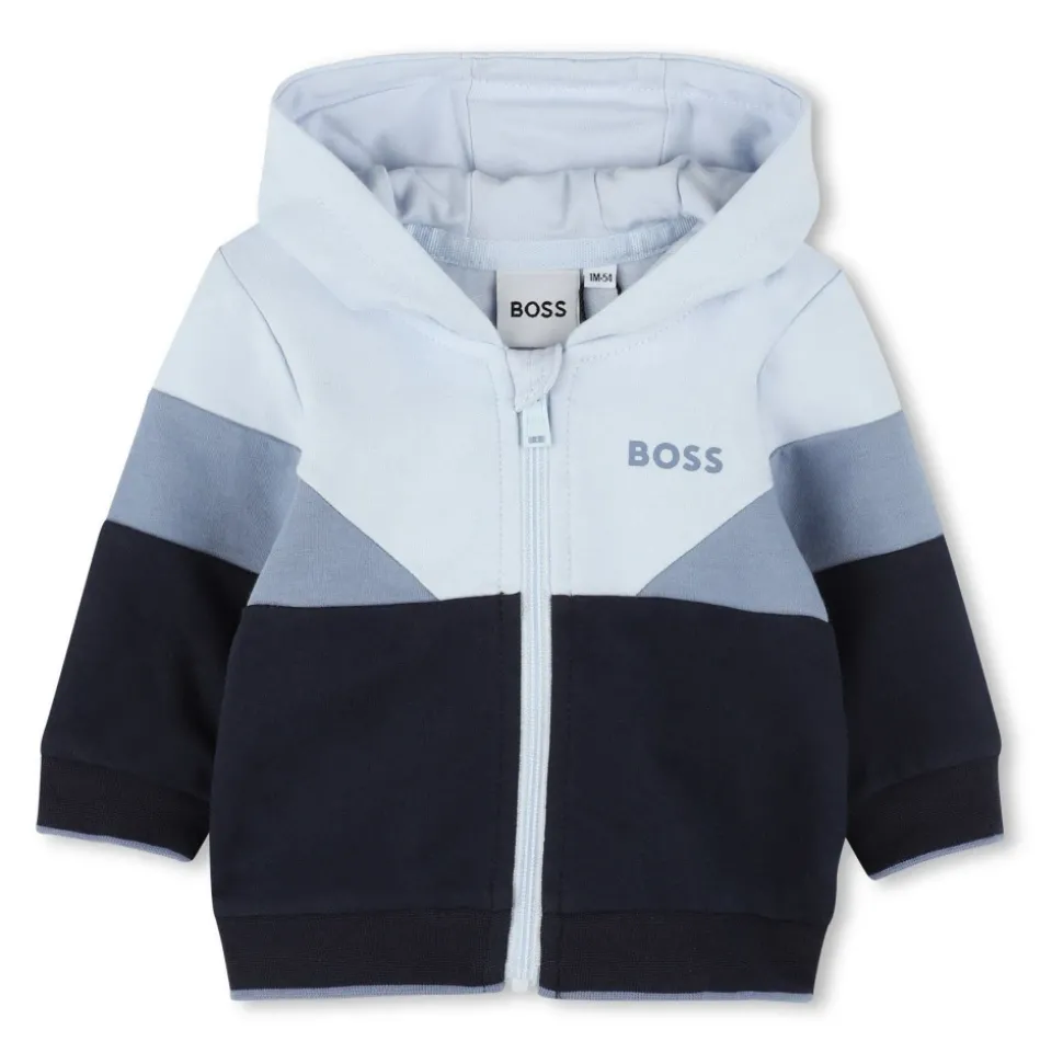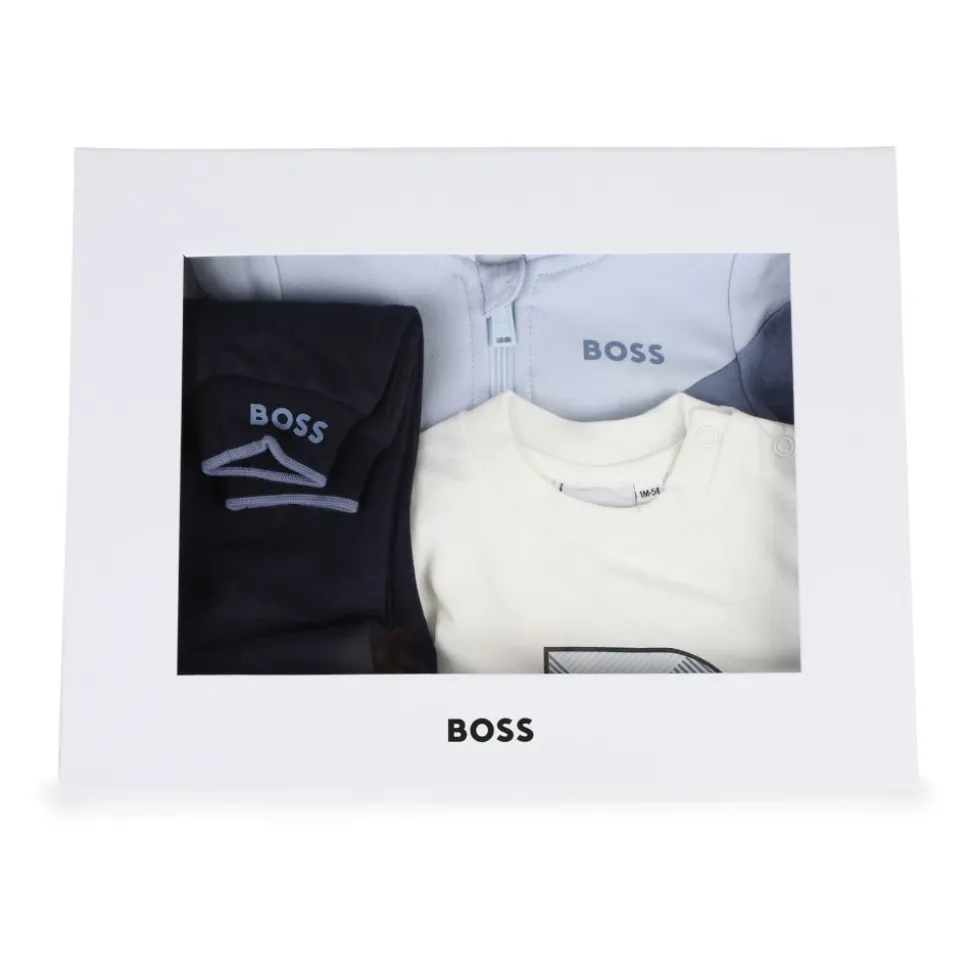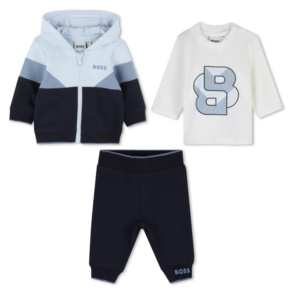 Kleed je kleintje in stijl met deze Sportieve 3-delige kledingset van Hugo Boss. Perfect voor speciale gelegenheden, deze set combineert comfort en elegantie met zijn hoogwaardige materialen en verfijnde details. Belangrijkste kenmerken: Marine | Blauw | 95% Katoen | 5% Elastaan | Ritssluiting | Drukknoopsluiting | Cardigan met capuchon | Geribbelde manchetten | Gedrukt logo | Double B print | Afmetingen en pasvorm: Regular fit | Samenstelling en onderhoud: 95% Katoen | 5% Elastaan | Voering: 96% Katoen | 4% Elastaan | Volg de wasinstructies op het etiket van het kledingstuk.