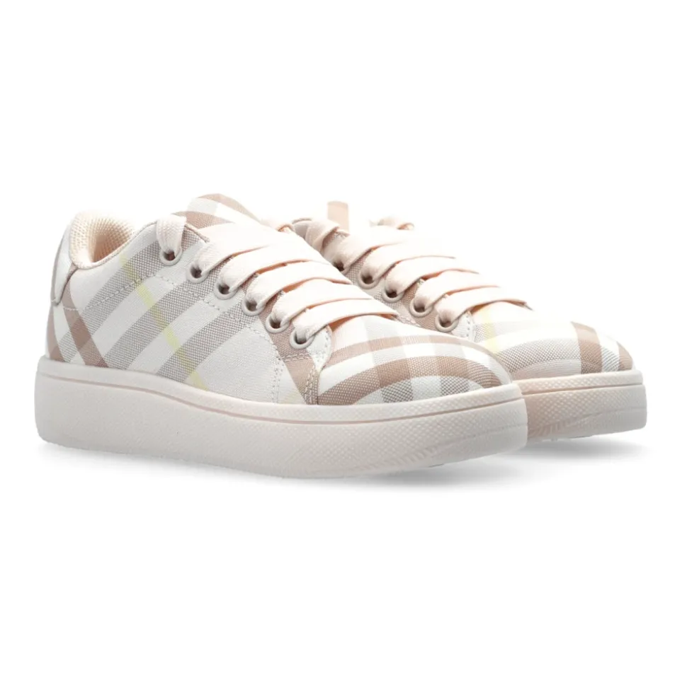 BURBERRY KIDS SNEAKERS belichamen tijdloze elegantie en Britse verfijning binnen een klassieke sneaker-silhouet. De harmonieuze mix van subtiele roze, beige, crème en pastelgeel boeit met zijn voortreffelijke verfijning, terwijl het gedurfde ruitpatroon op het textiel bovenwerk de prestige van het product benadrukt, kenmerkend voor de luxe collecties van Burberry. DE STEVIGE, PLATTE RUBBEREN ZOOL en zorgvuldig afgewerkte interieur zorgen voor ongeëvenaard draagcomfort en duurzaamheid, zelfs bij intensief gebruik. De reliëf