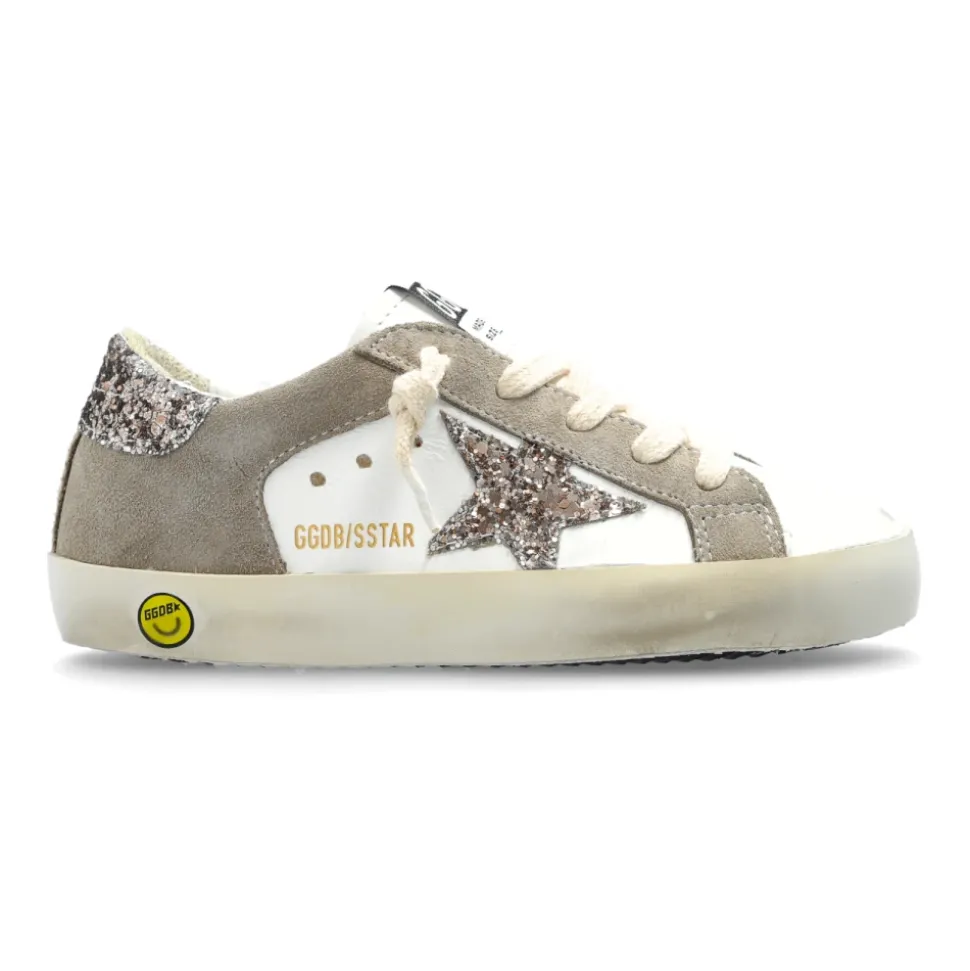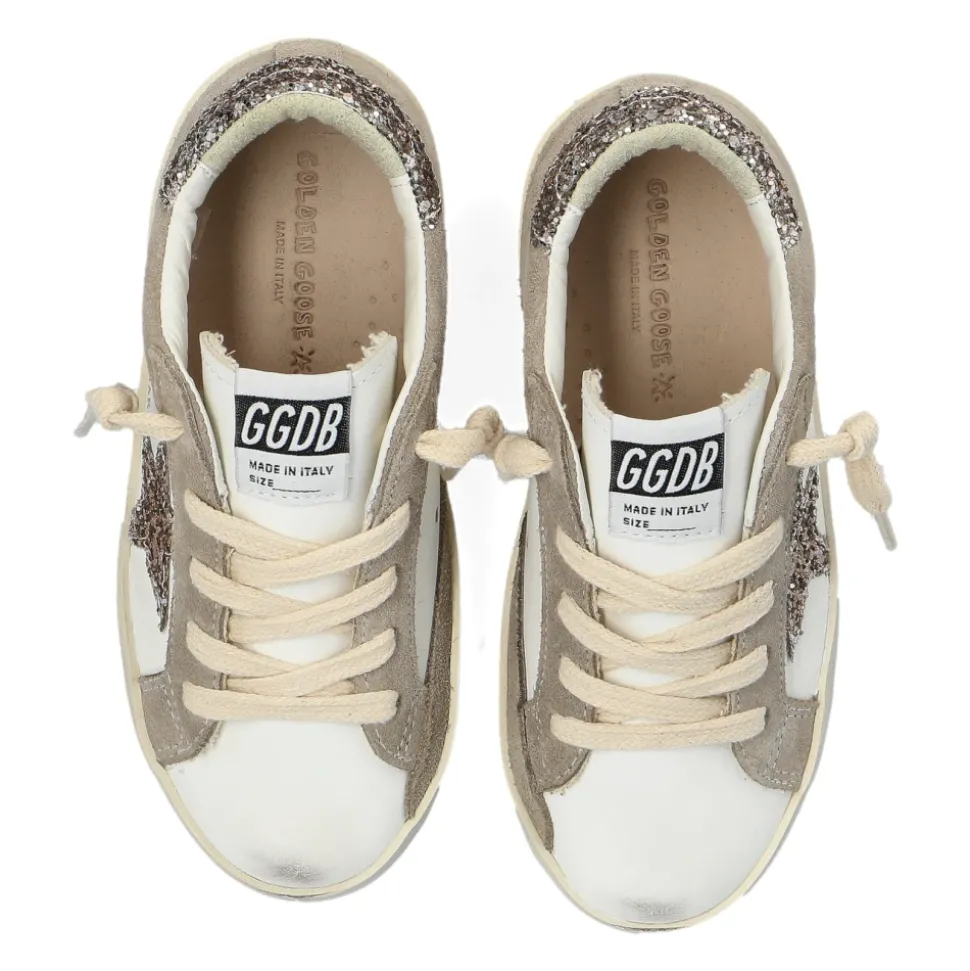 De SUPER-STAR DOUBLE QUARTER WITH LIS sneakers van Golden Goose Kids zijn een prachtige fusie van traditie en eigentijdse stijl. De klassieke lage sneaker-silhouet met een ronde neus wordt verheven door verfijnde details – suède grijstinten contrasteren harmonieus met glinsterende glitteraccenten op de ster, hiel en tong. Een gouden “GGB/SSSTAR”-print en het subtiele merklogo benadrukken het exclusieve karakter van dit product. Het opvallende kenmerk van deze schoenen is de DOELBEWUSTE VERSLETENHEID en beschadigingen, vakkundig aangebracht op zowel de zool als het bovenwerk, waarbij vakmanschap wordt getoond. De combinatie van leren en stoffen lagen zorgt voor uitzonderlijk comfort en duurzaamheid, terwijl klassieke beige veters een harmonieus geheel vormen met het verfijnde kleurenpalet. WAAROM ZOU U DIT PRODUCT MOETEN KIEZEN? * Origineel Italiaans vakmanschap van Golden Goose Kids * Unieke uitstraling met een versleten bovenwerk en glinsterende details * Premium materialen garanderen de hele dag draagcomfort * Praktisch ontwerp ideaal voor de actieve levensstijl van kinderen * Exclusiviteit en tijdloze esthetiek