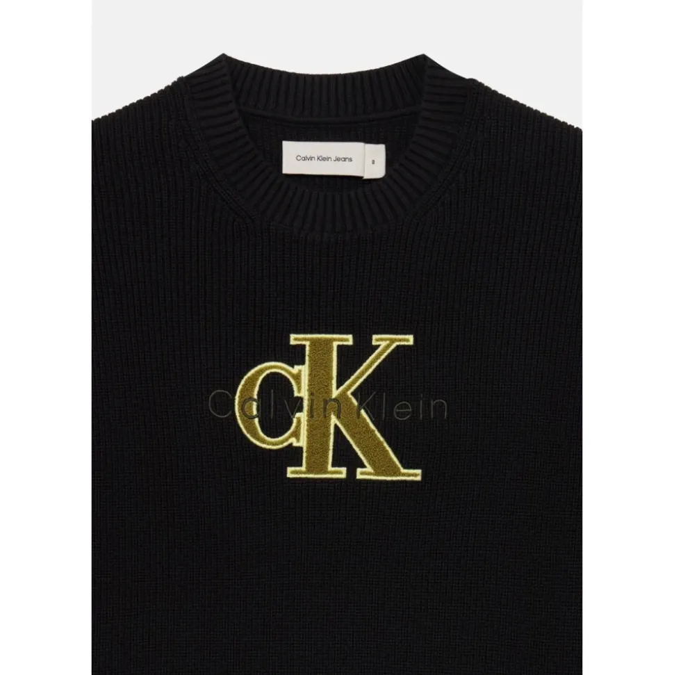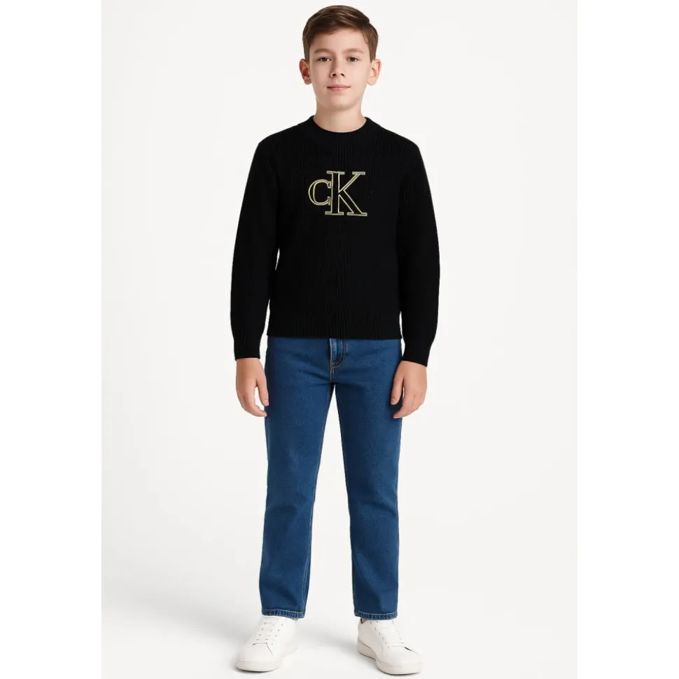 Calvin Klein Jeans kindertrui, model Stitch, een warm en verfijnd stuk ideaal voor de koelere maanden. Gemaakt van 100% katoenen breisel, zorgt het voor zachtheid, comfort en ademend vermogen, met een reguliere pasvorm en klassieke stijl. Het zwarte ronde hals ontwerp heeft lange mouwen en een groot CK Calvin Klein-logo geborduurd in gouden draad op de borst, voor een moderne en elegante uitstraling. Pasvorm: regulier Lengte: normaal Halslijn: ronde hals Mouwen: lang Details: geborduurd voorlogo in goud Samenstelling: 100% katoen Verzorging: machinewas op 30° Een veelzijdige en tijdloze trui, perfect voor school, vrije tijd en casual chique looks gecombineerd met jeans of elegante broeken.