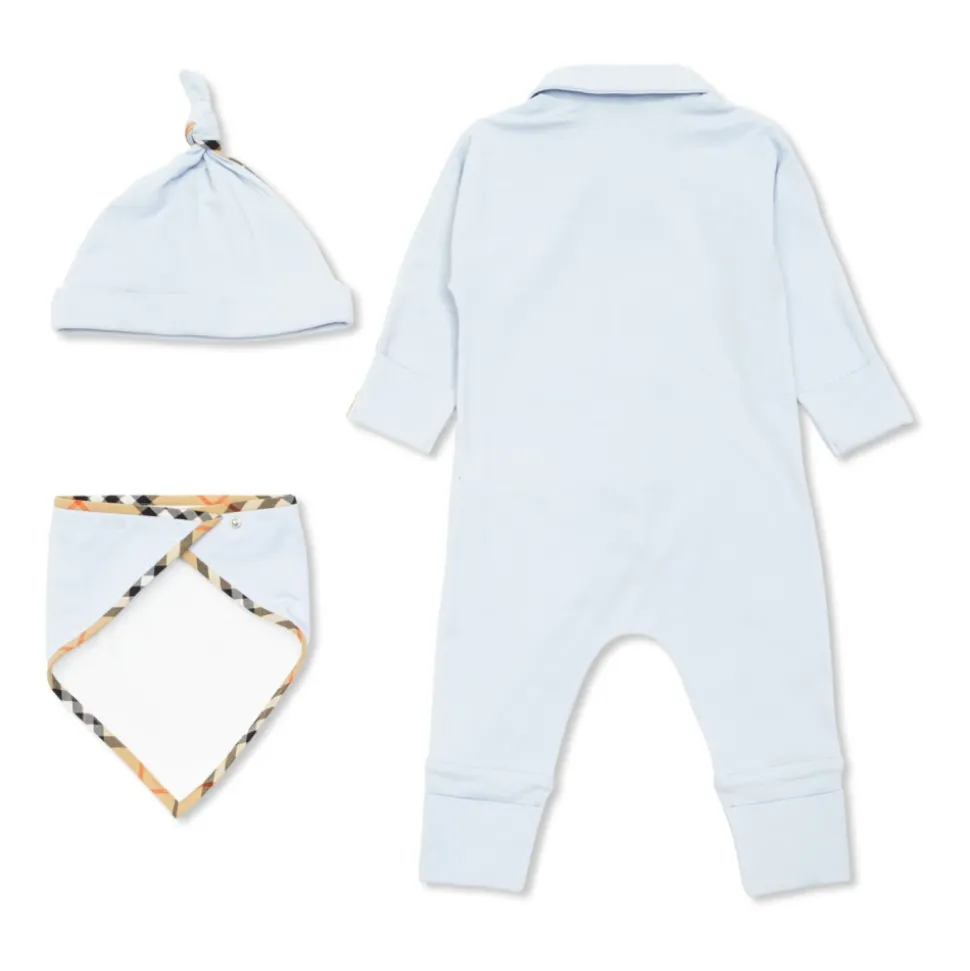 De Burberry Stretch Katoenen Driedelige Geschenkset combineert een onesie, slabbetje en muts in een lichtblauwe tint met de kenmerkende ruitdetails van het label. Gemaakt van zacht stretchkatoen, combineert het verfijnde afwerkingen en een decoratieve afgeronde kraag voor comfortabel, gekleed draagcomfort. Belangrijkste kenmerken: Blauw | Lichtblauw | Katoen | Stretchstof | Zachte katoenbreisel | Zacht voor de huid | Inclusief onesie, slabbetje en muts | Drukknoopsluitingen | Geïntegreerde wanten en slofjes | Afgeronde decoratieve kraag | Kenmerkende ruitbies op de binnenkant van de kraag | Zorgvuldig afgewerkte randen | Afmetingen & pasvorm: Stretchstof | Samenstelling & verzorging: 96% katoen, 4% elastaan | Machinewas op 30°C.