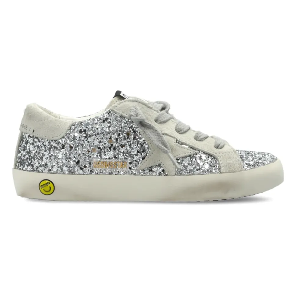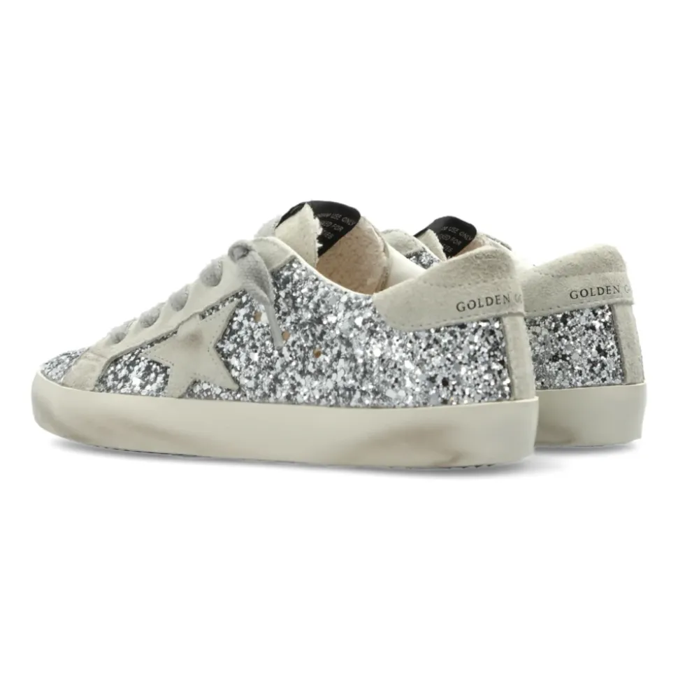 Golden Goose Super-Star Young sneakers combineren een klassiek silhouet met een zilverkleurige glitter bovenkant en grijze suède details voor een opvallende maar draagbare look. Belangrijkste kenmerken: Grijs | Zilver | Leer, textiel, synthetisch | Flexibele rubberen zool | Leren en textiele voering | Laag silhouet | Afgeronde neus | Zilverkleurige glitter bovenkant | Grijs suède stermotief en hiellus | Zwart logo op de tong | Gouden “GOLDEN GOOSE” print op de hiellus | Vintage afwerking | Handgemaakte details | Afmetingen & pasvorm: Zoolhoogte: 2 cm | Zoolhoogte op het hoogste punt: 2,5 cm | Samenstelling & verzorging: Bovenkant: 29% polyethyleen, 25% polyurethaan, 24% rundleer, 11% katoen, 11% viscose | Voering: 60% rundleer, 40% katoen | Zool: 100% rubber