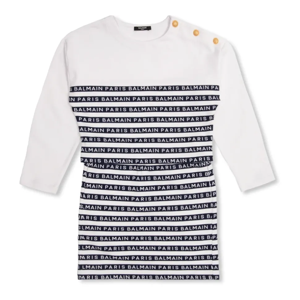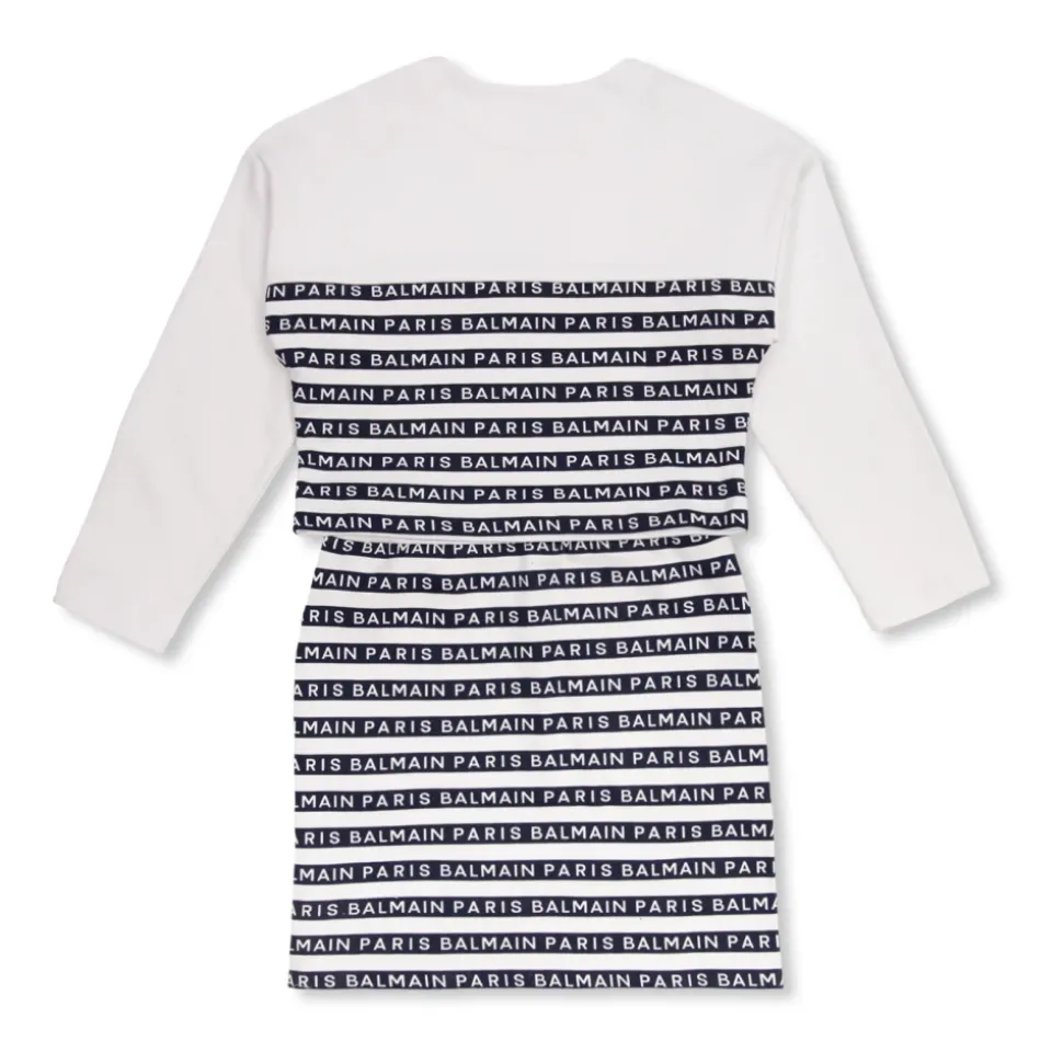 Wit en marineblauw sweatshirt en rok set van Balmain Kids. Gemaakt van katoen, is dit ontwerp versierd met een streepjespatroon met een logo. Het sweatshirt met ronde hals heeft drukknopen met leeuwenhoofd-details, een ronde hals en lange mouwen. De rok heeft een elastische tailleband.