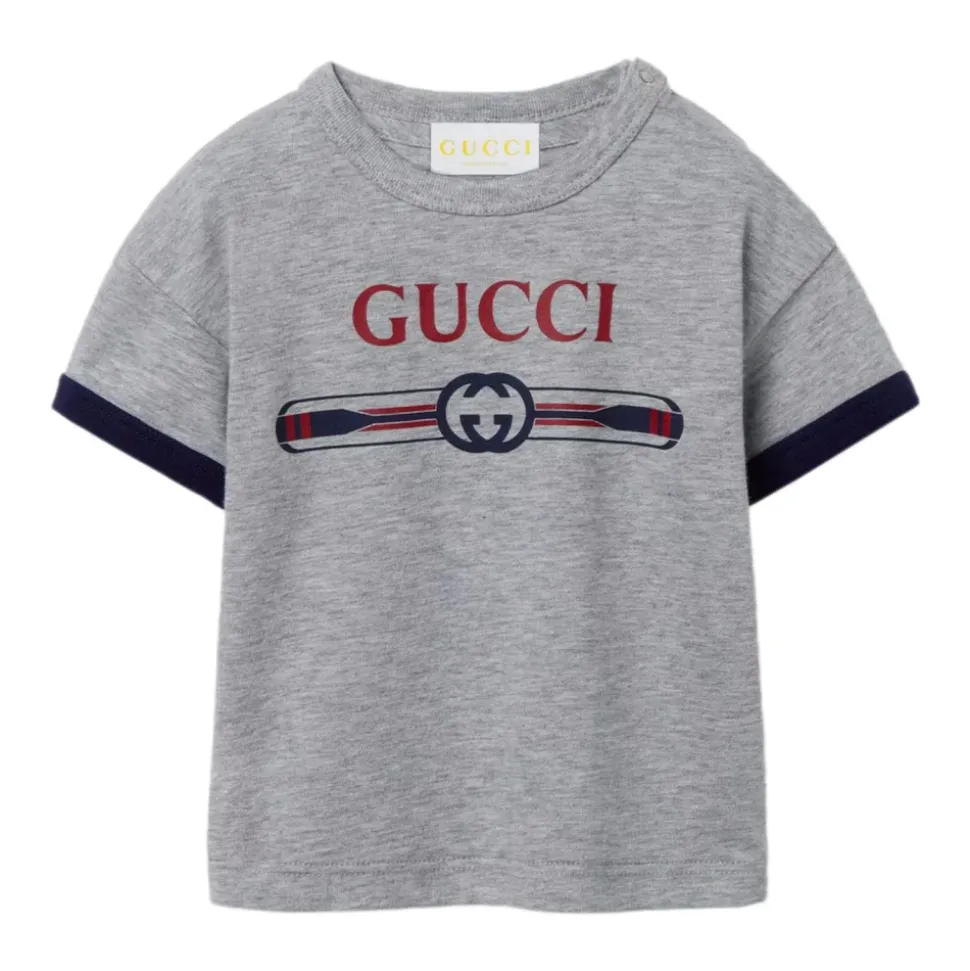 Gucci`s T-shirt van lichtgrijze katoenen jersey is voorzien van marineblauwe afwerkingen en een opvallende Gucci-print met verstrengelde roeispanen, wat een stijlvolle en comfortabele keuze biedt voor dagelijks gebruik. Belangrijkste kenmerken: Lichtgrijs | Marineblauw | Katoenen Jersey | Drukknoop langs de schoudernaad | Ronde hals | Korte mouwen | Geribbelde zoom | Afmetingen en pasvorm: Oversized pasvorm op de schouders | Samenstelling en onderhoud: 100% Katoen | Machinewas koud, droogtrommel laag