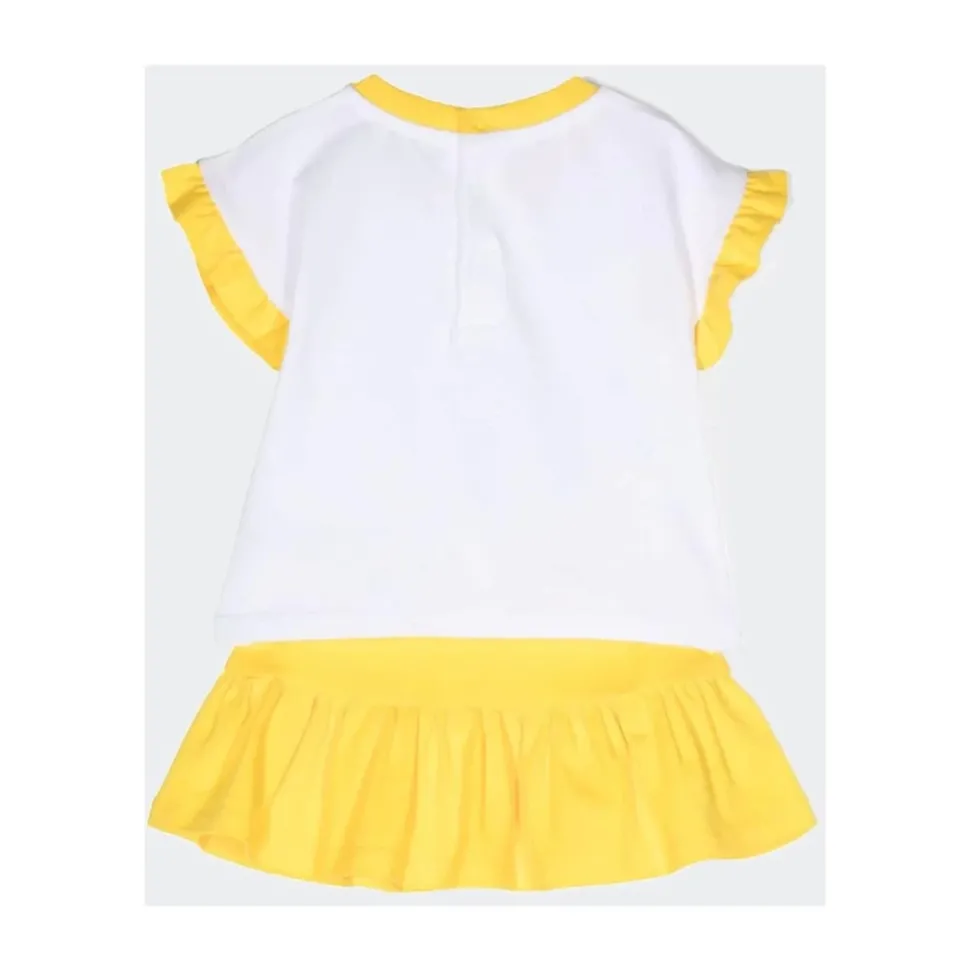 De Moschino T-shirt en Rok Set combineert een T-shirt met ronde hals en print met een sluiting met drukknoopjes op de rug en een effen rok met ruches, ontworpen voor een gemakkelijke, alledaagse styling. Belangrijkste kenmerken: Multicolor | Giallo | Katoen | Tweedelige set | Sluiting met drukknoopjes op de rug | Ronde hals | Korte mouwen | Print op de voorkant | Rok met ruches | Effen rok | Samenstelling & verzorging: 95% katoen, 5% elastaan | Volg de wasvoorschriften op het binnenlabel van het kledingstuk.