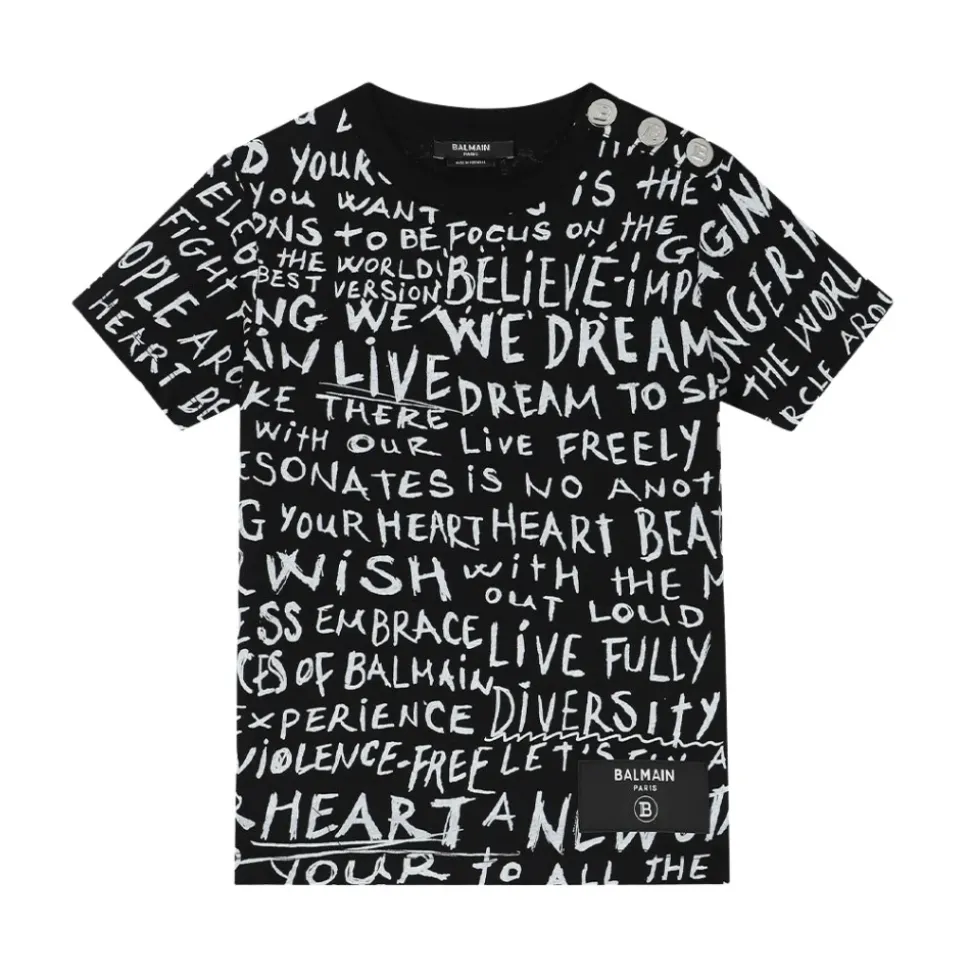 Balmain T-shirt met ronde hals is een lichtgewicht katoenen shirt met een all-over patroonprint en een contrasterend logo, ontworpen voor casual kleding bij warm weer. Schouderknopen zorgen voor gemakkelijk aankleden en een opvallend detail. Belangrijkste kenmerken: Zwart | Nero | Katoen | Lichtgewicht | Knopen op de schouder | Ronde hals | Korte mouwen | All-over patroonprint | Contrasterend logo | Samenstelling en onderhoud: 100% Katoen | Machinewas op 30°C. Niet strijken. Niet wassen met lichte kleuren. Geen bleekmiddel gebruiken.