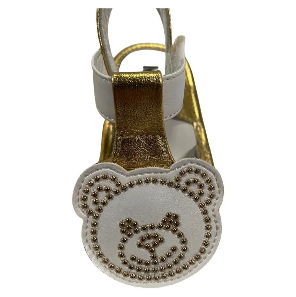 Moschino Teddybeer leren sandalen zijn voorzien van de kenmerkende Teddybeer patch van het merk op een glad leren silhouet, gemaakt voor gemakkelijk dagelijks gebruik. Modelnaam bevestigd als “Teddybeer leren sandalen”; een specifiek designer-ID kon niet worden bevestigd uit beschikbare bronnen. Belangrijkste kenmerken: Geel | Goudkleurig | Leer | Klittenbandsluiting | Glad leren interieur | Ronde, semi-open teen | Contrasterende witte Teddybeer patch met mini-stud detail | Logo print aan de zijkant | Glad leren bovenwerk | Samenstelling & verzorging: Bovenkant: leer | Voering: leer | Binnenzool: leer | Zool: rubber