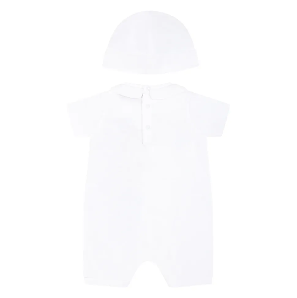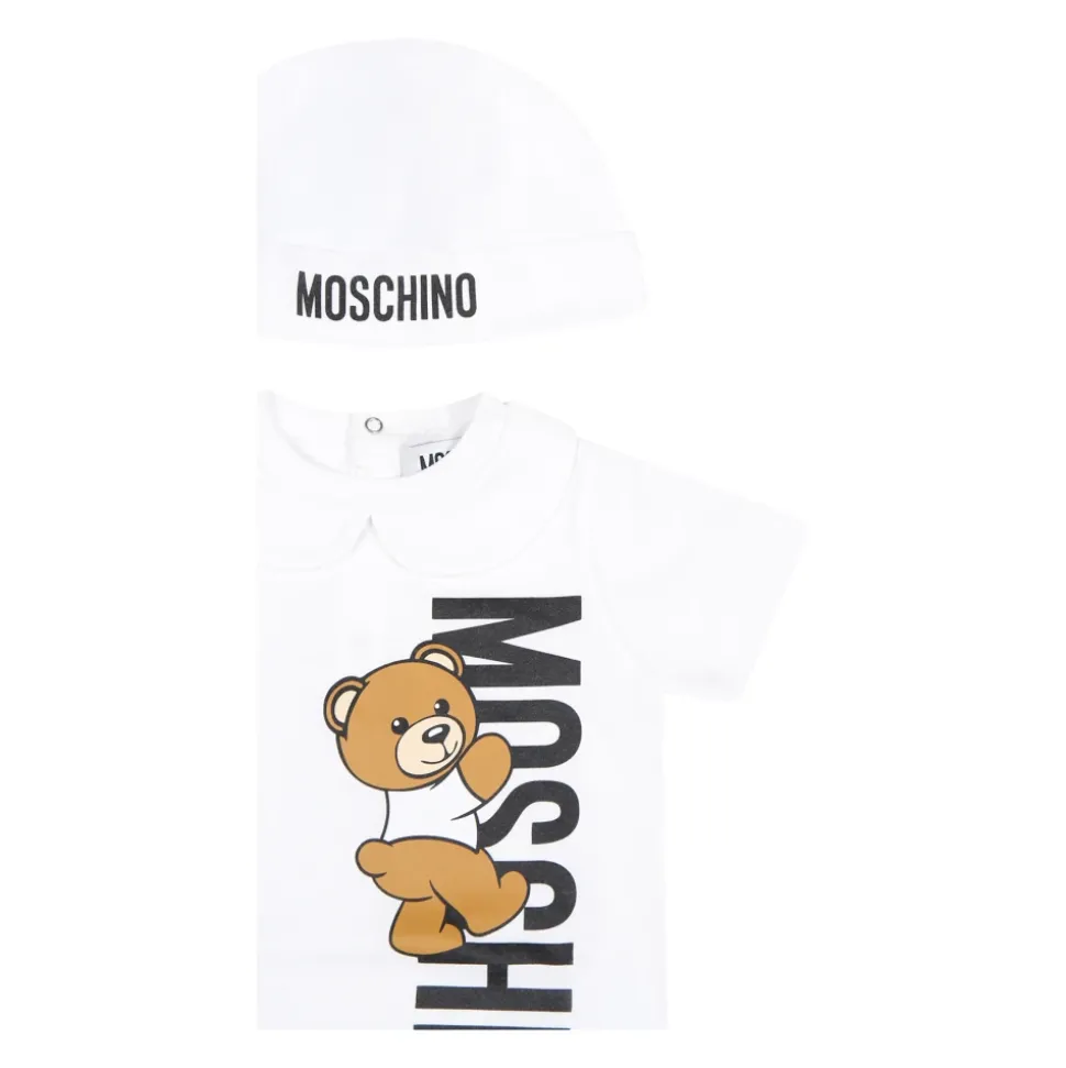 Kleed je kleintje in stijl met deze witte Moschino set gemaakt van stretch katoenen jersey. De set bestaat uit een pakje met korte mouwen, peter pan kraag, drukknoopsluiting en een schattige Teddy Bear print met een zwart logo aan de zijkant. De bijpassende muts heeft een omslag en een zwart logo aan de voorkant. Gemaakt van 100% katoen. Machinewasbaar op 30°C.