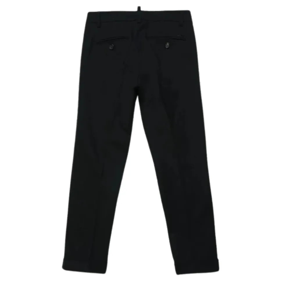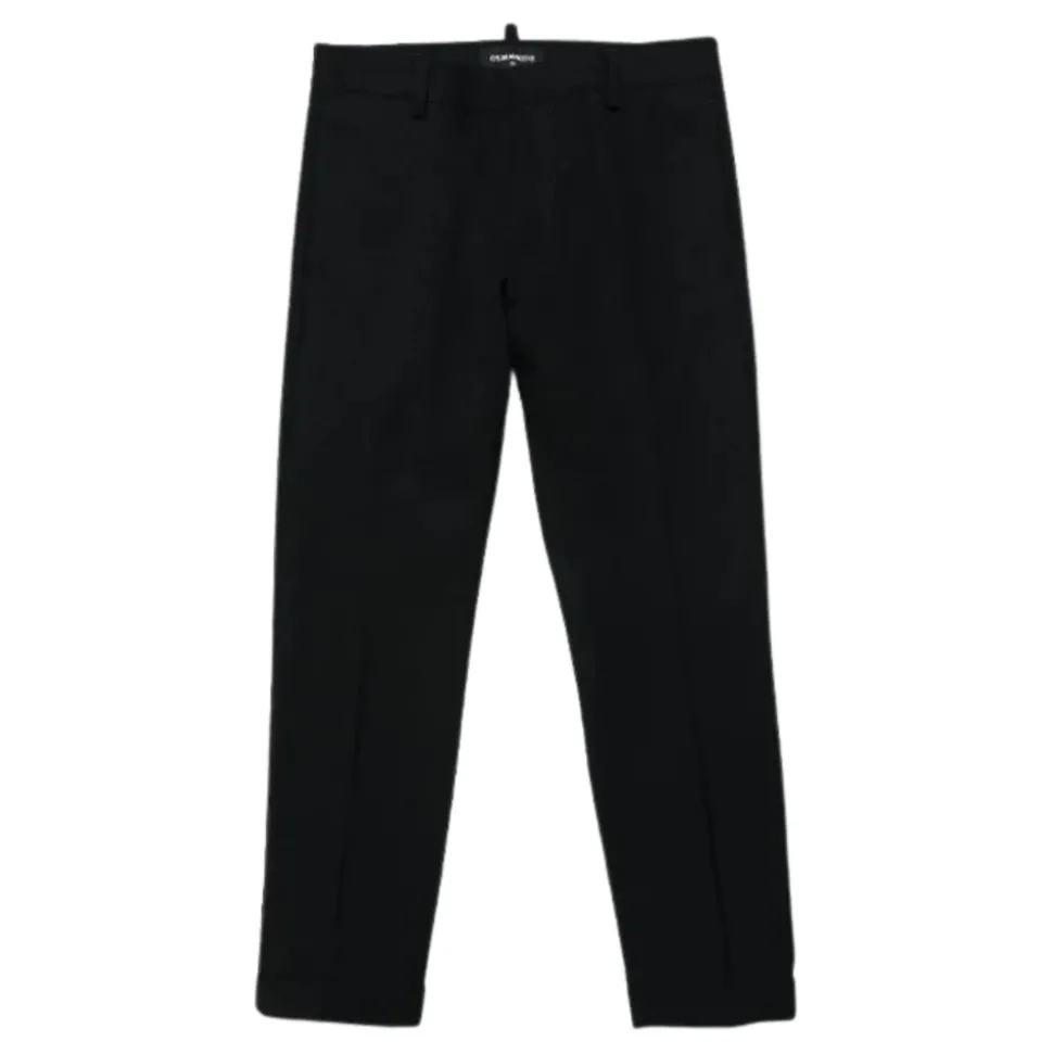 Dsquared2 Trousers zijn een op maat gemaakte pantalon, vervaardigd uit zuiver scheerwol, ontworpen voor een nette, alledaagse look met een normale taille en subtiele branding. Belangrijkste kenmerken: Zwart | Zuiver scheerwol | Twee zijzakken | Twee achterzakken met split | Normale taille | Metalen logo op de achterkant | Afmetingen & pasvorm: Regular fit | Samenstelling & verzorging: 95% zuiver scheerwol | 5% elastaan | Voering: 60% viscose | Voering: 40% polyester