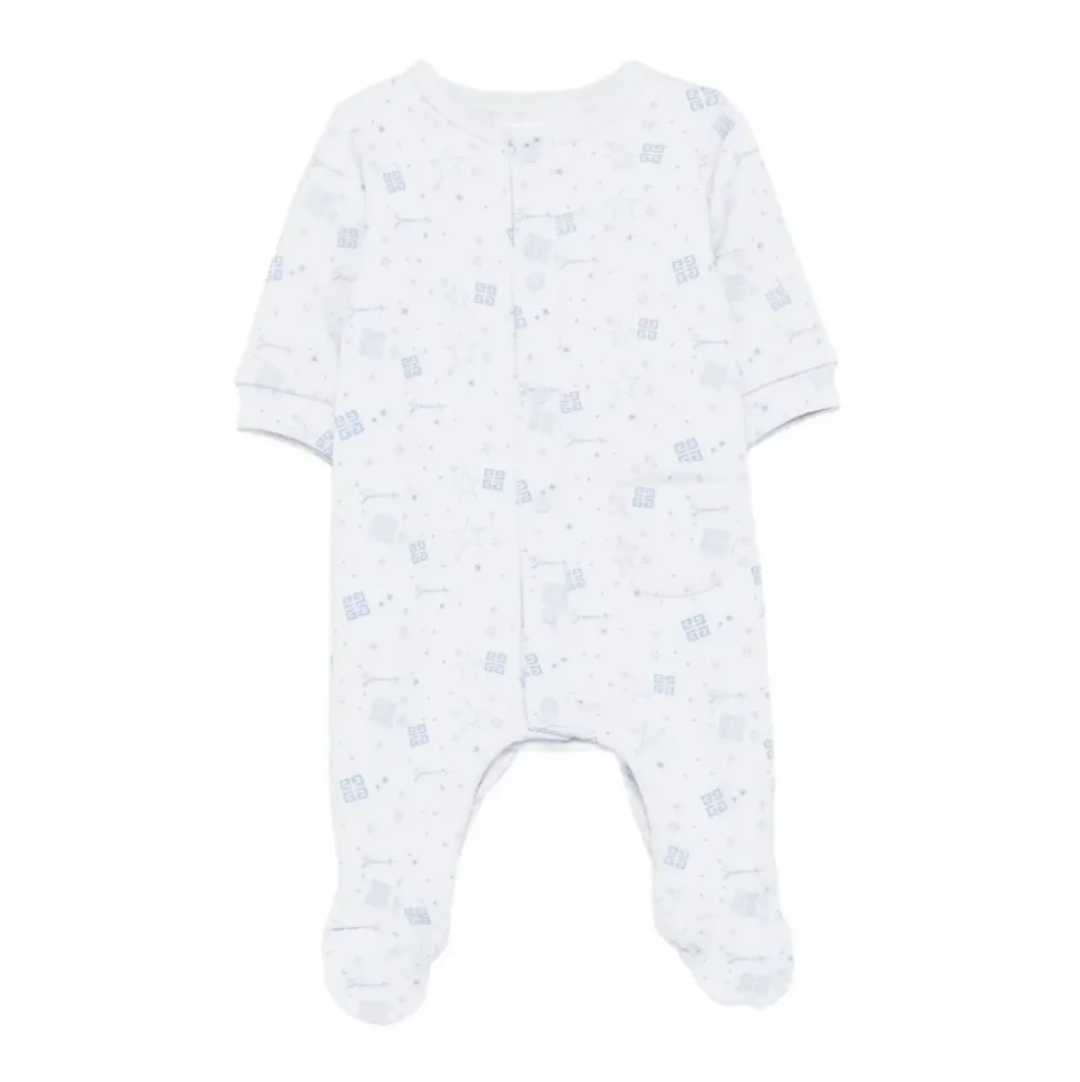 Givenchy Tutina con motivo a stelle is een romper met sterrenprint, een gedrukt logo, lange mouwen en ingebouwde voetjes. Het heeft een drukknoopsluiting voor snel aankleden en praktisch dagelijks gebruik. Belangrijkste kenmerken: Blauw | Lichtblauw | Drukknoopsluiting | Ingebouwde voetjes | Sterrenprintmotief | Logo print | Lange mouwen