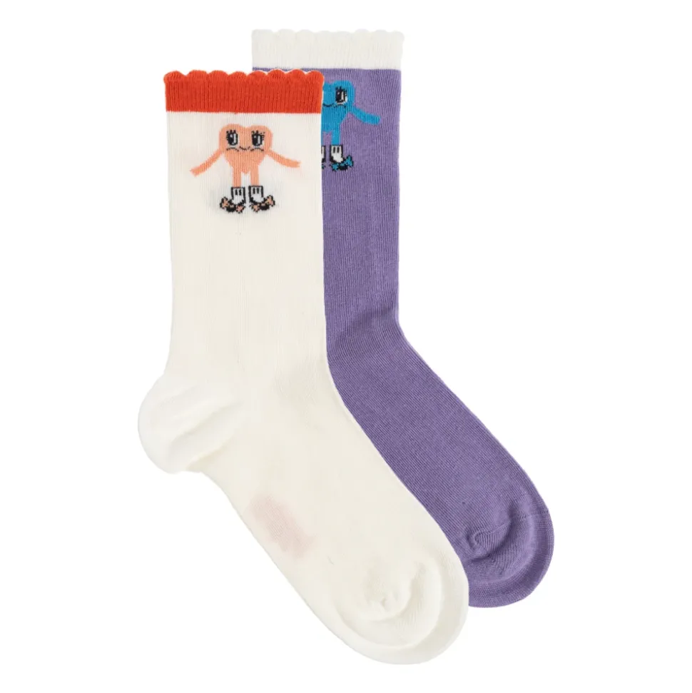 Mini Rodini Twee paar sokken combineert speelse geborduurde figuren met een zachte katoenen knit voor comfortabel dagelijks gebruik. De set combineert twee meerkleurige designs en is voorzien van een decoratieve golvende boord voor een onderscheidende afwerking. Belangrijkste kenmerken: Multicolor | Multicolour | Katoen | Ademende knit | Stretch voor bewegingsvrijheid | Twee paar | Elastische boorden | Geborduurd figuur met rolschaatsen | Golvende boord | Tweekleurige combinaties (crème met oranje boord; paars met witte afwerking) | Afmetingen & pasvorm: Ideale pasvorm | Stretch voor bewegingsvrijheid | Samenstelling & verzorging: Katoen | Elastaan