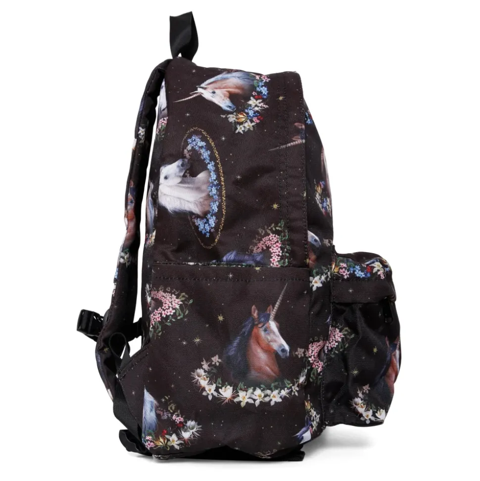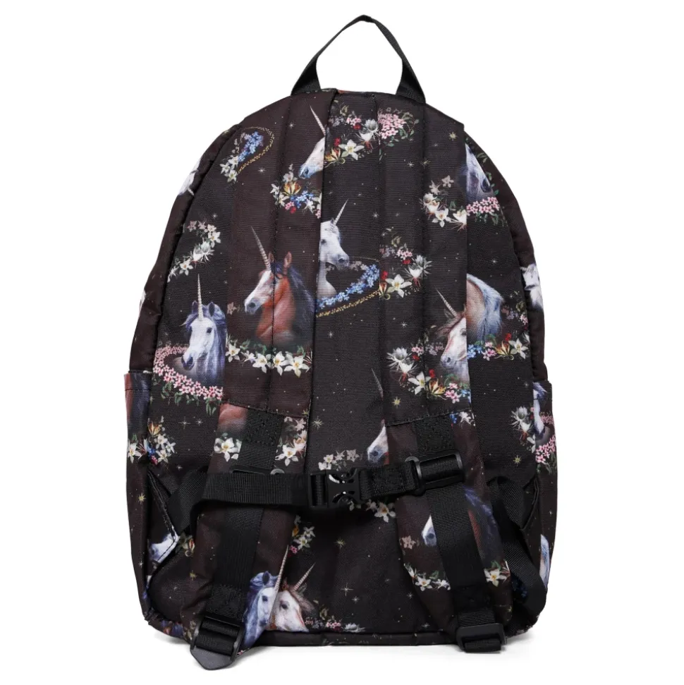 Maak je kleintje klaar voor school met deze stijlvolle Molo zwarte rugzak. Gemaakt van polyester, met een ritssluiting aan de bovenkant, een ritsvak aan de voorkant, zijvakken en verstelbare schouderbanden met kliksluiting. De rugzak is versierd met een leuk eenhoornpatroon. Afmetingen: 41cm x 28cm x 19cm. Materiaal: 100% Polyester.