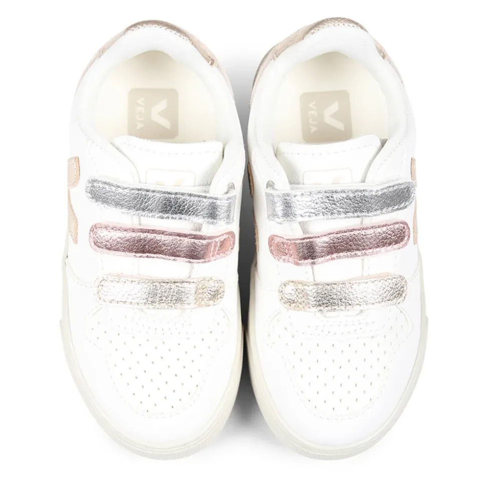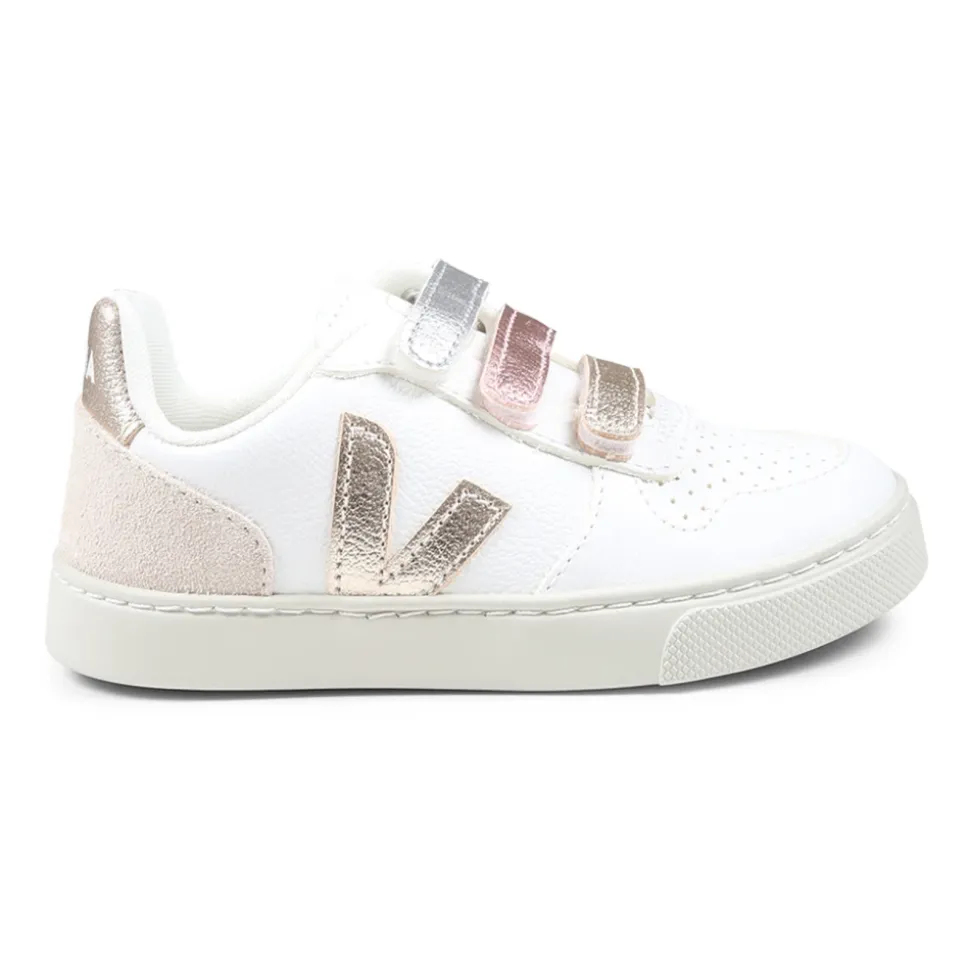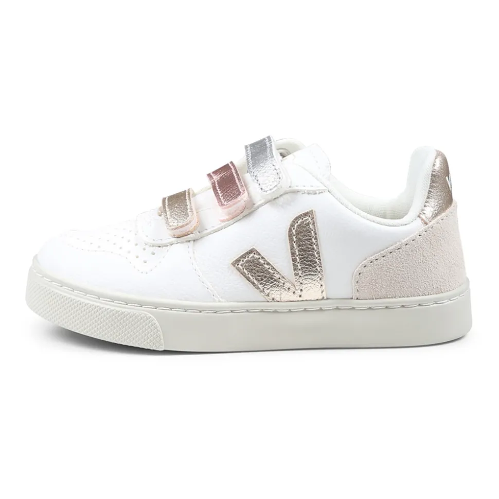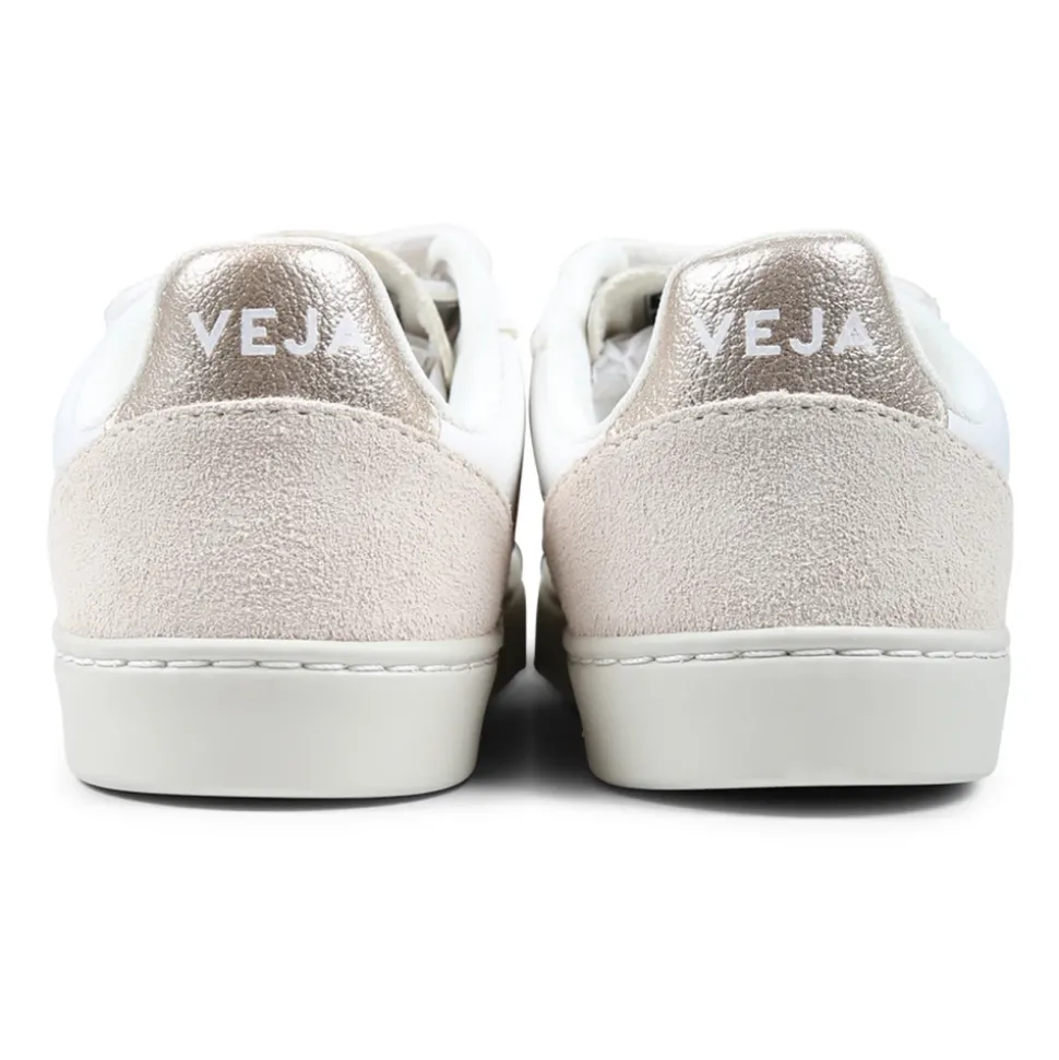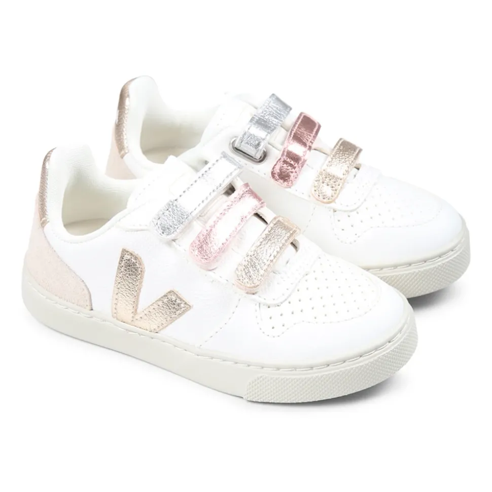 De Veja V-10 Sneakers combineren stijl en comfort met hun chroomvrij leer en veelkleurige metallic banden, ideaal voor dagelijks gebruik. Belangrijkste kenmerken: Wit | Multicolor | Wit | Leer | Klittenbandsluiting | Metallic banden | Suède inzetstuk op de hiel | Gouden logo op de zijkanten | Afmetingen en pasvorm: Valt groot, neem een halve of hele maat kleiner | Samenstelling en onderhoud: 100% leer