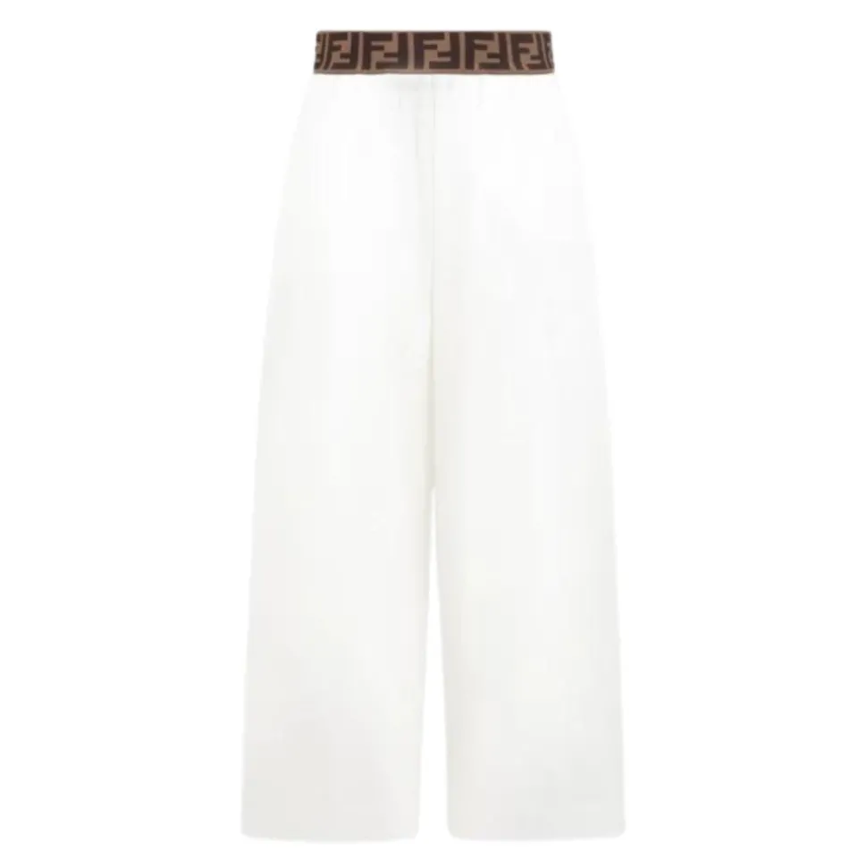 Maak kennis met de Fendi Junior wijde pijpen broek, een stijlvolle toevoeging aan elke garderobe. Deze broek is voorzien van een opvallende bruine elastische tailleband met het iconische FF-logo en biedt zowel mode als functionaliteit. Belangrijkste kenmerken: Wit | Bruin | 79% Katoen | 16% Polyamide | 5% Elastaan | Zijzakken | Achterzak | Wijde pijpen | Elastische tailleband | Afmetingen en pasvorm: Wijde pijpen fit | Samenstelling en onderhoud: 79% Katoen | 16% Polyamide | 5% Elastaan | Machinewas koud, droogtrommel laag
