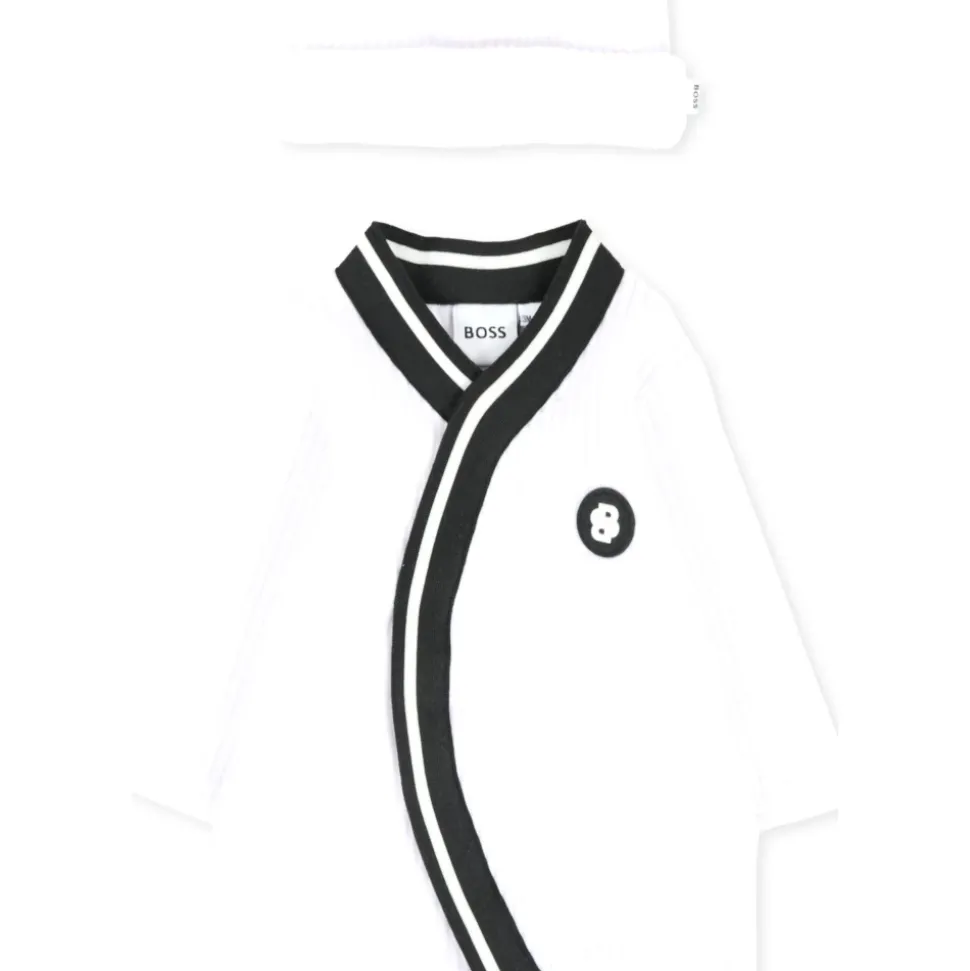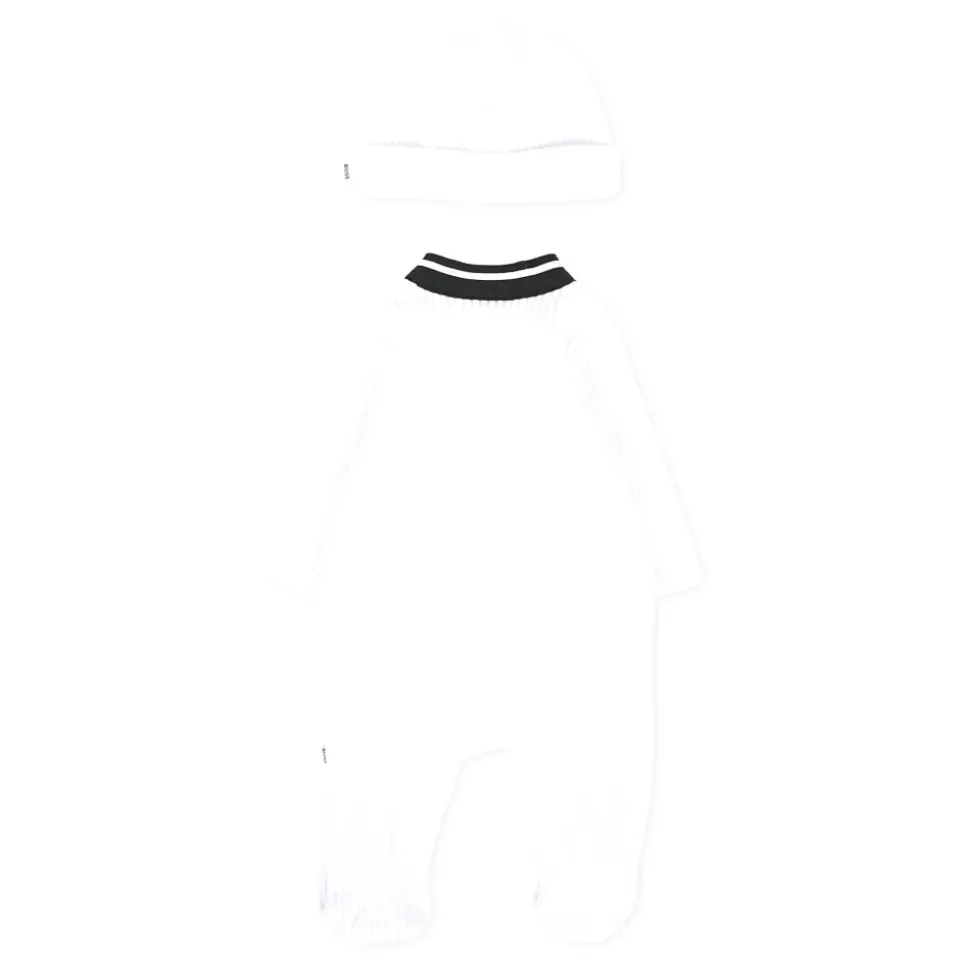 Kleed je kleintje in stijl met deze Hugo witte chenille babygrow en hoed set. De set bevat een lange mouw onesie met drukknoopsluiting, witte details en voetjes, versierd met een rubberen logopatch op de borst. Maak de look compleet met de omgeslagen hoed. Gemaakt van 70% katoen, 28% polyester en 2% elastaan. Machinewas op 30°C.