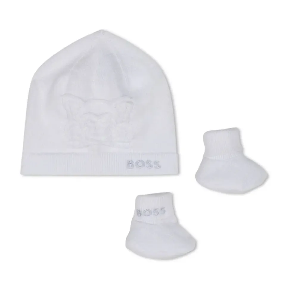 Upgrade de stijl van je kleintje met deze Hugo witte gebreide accessoireset, bestaande uit een muts en slofjes. De muts heeft een geribbelde zoom, geborduurd voorlogo en panda-design, terwijl de slofjes een manchet en logo aan de zijkant hebben. Gemaakt van 100% katoen. Machinewasbaar op 30°C.