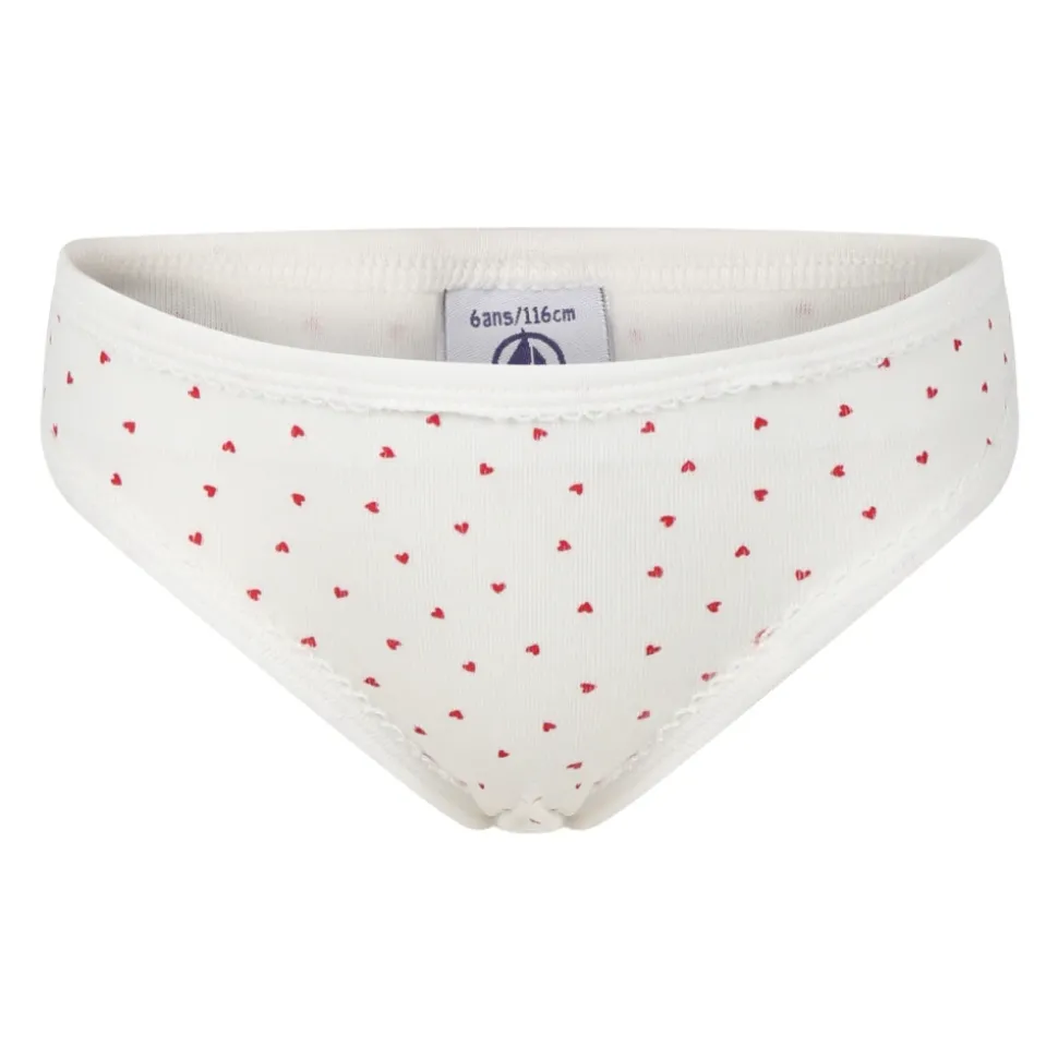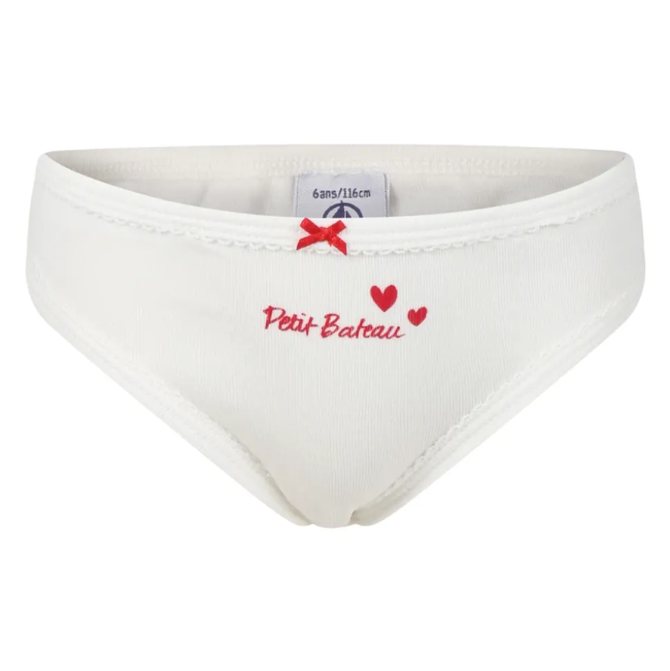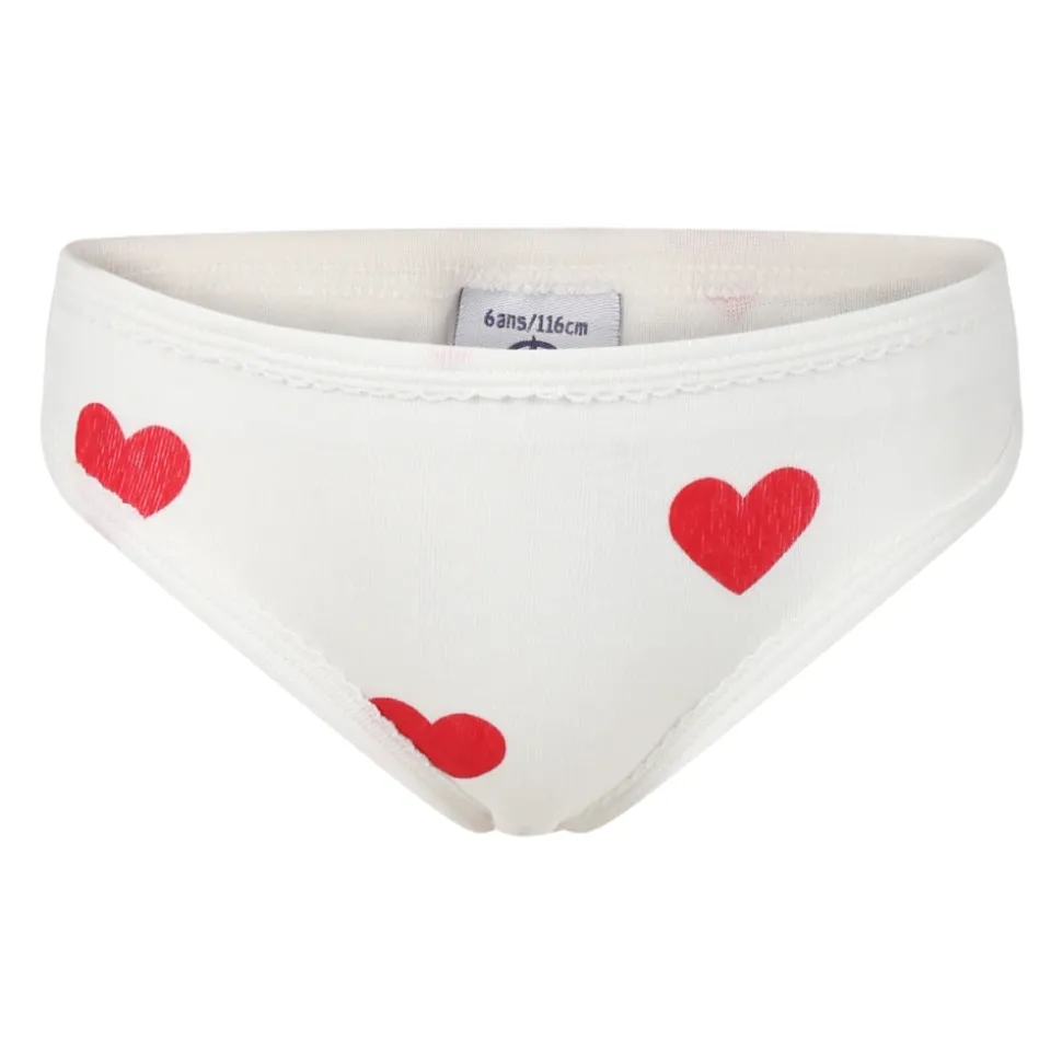 Petit Bateau witte set van drie geribbelde slips voor kinderen. Een paar is versierd met harten, Petit Bateau schrijven en een rode strik, een ander heeft allover harten, en het derde paar heeft harten en logo. Gemaakt van 100% katoen uit de landbouw, die de bodem respecteert en vrij is van GGO’s. Machinewasbaar op 40°C.