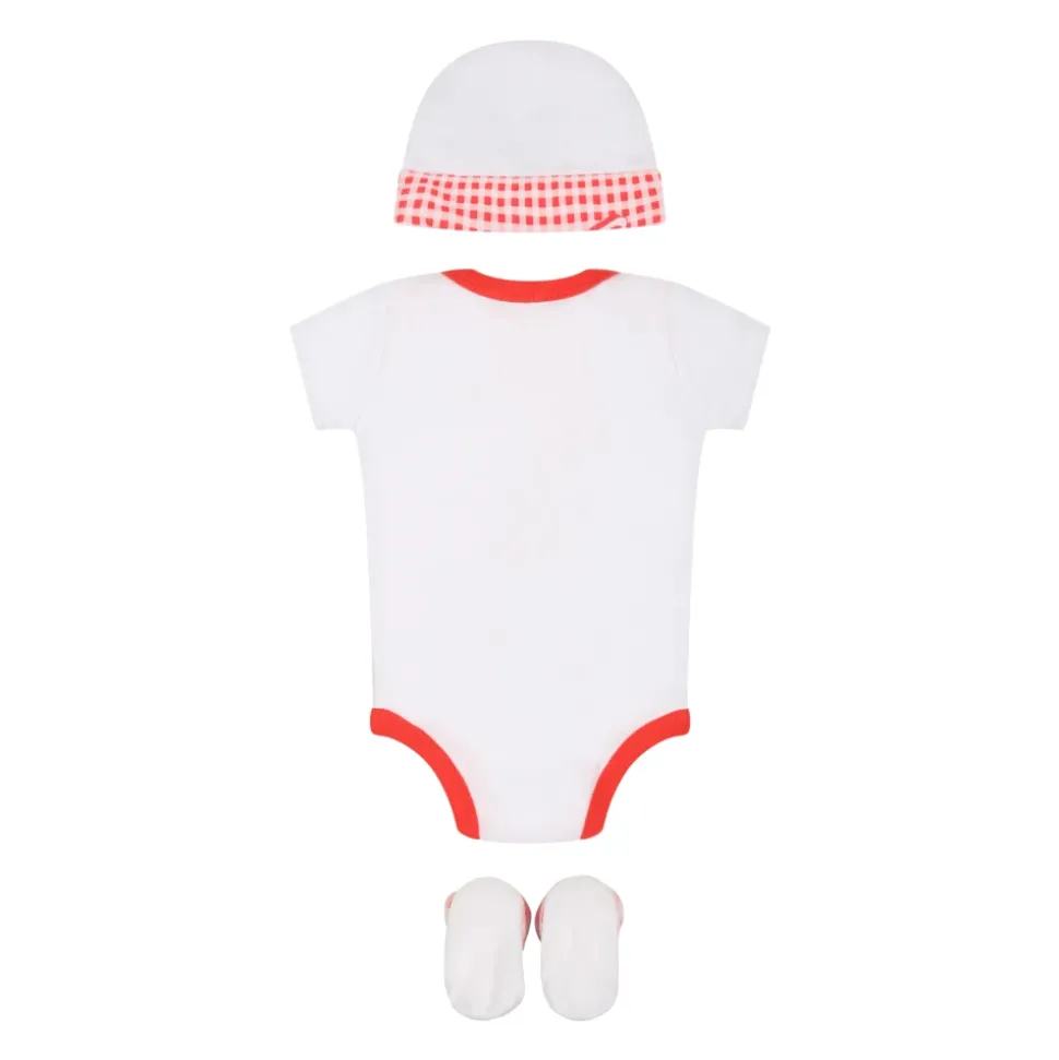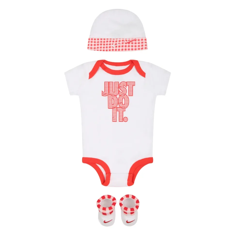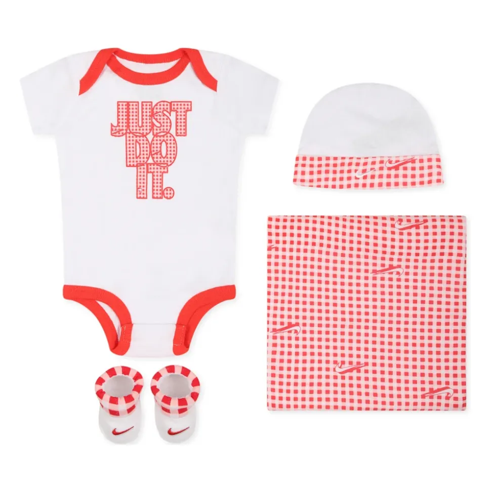 Kleed je kleintje in stijl met deze Nike witte set gemaakt van een comfortabele katoenmix. De set bevat een rompertje, sokken, muts en deken, allemaal met unieke ontwerpdetails zoals een bedrukt rompertje, geruite sokken en muts, en een veelkleurige deken met rode profielen en iconische swoosh. Gemaakt van 60% katoen en 40% polyester. Machinewasbaar op 30°C. Afmeting: 75 x 68 cm.