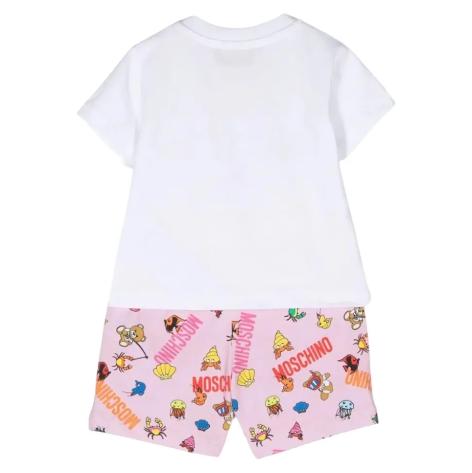 Kleed je kleine meisje in stijl met deze witte MOSCHINO set, ontworpen voor de modebewuste vrouw.
