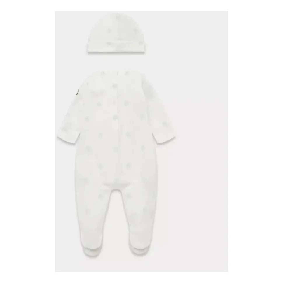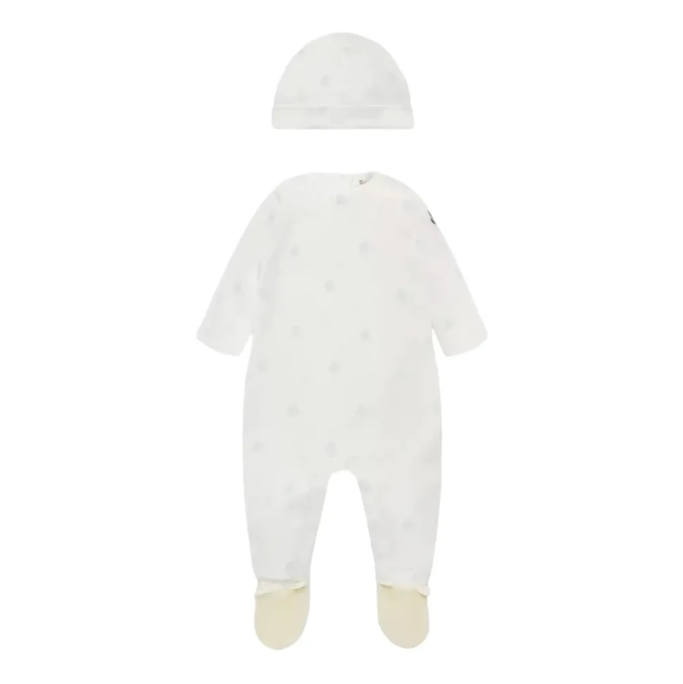 Moncler Kids witte babyromperset versierd met blauw logo overal ronde hals lange mouwen logopatch op de linkermouw drukknoopsluiting aan de achterkant en aan de binnenzijde van het been lange broekspijpen die de voet bedekken inclusief logo muts set gemaakt van zachte katoen.
