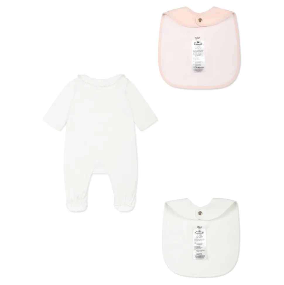 Kleed je kleintje in stijl met deze witte babygrow set van Chloé Kids. Gemaakt van 100% katoen, inclusief een babygrow met lange mouwen en twee slabbers, perfect voor comfort en gemak. Belangrijkste kenmerken: Wit | Roze | 100% Katoen | Drukknoopsluiting | Inclusief voetjes | Geborduurde kraag | Goudkleurig logo op de voorkant | Samenstelling en onderhoud: 100% Katoen | Machinewasbaar op 30°C
