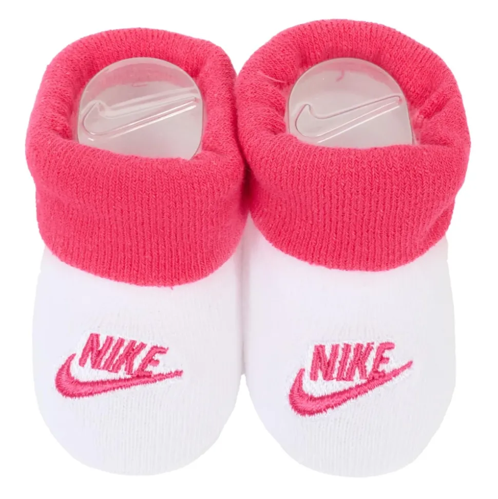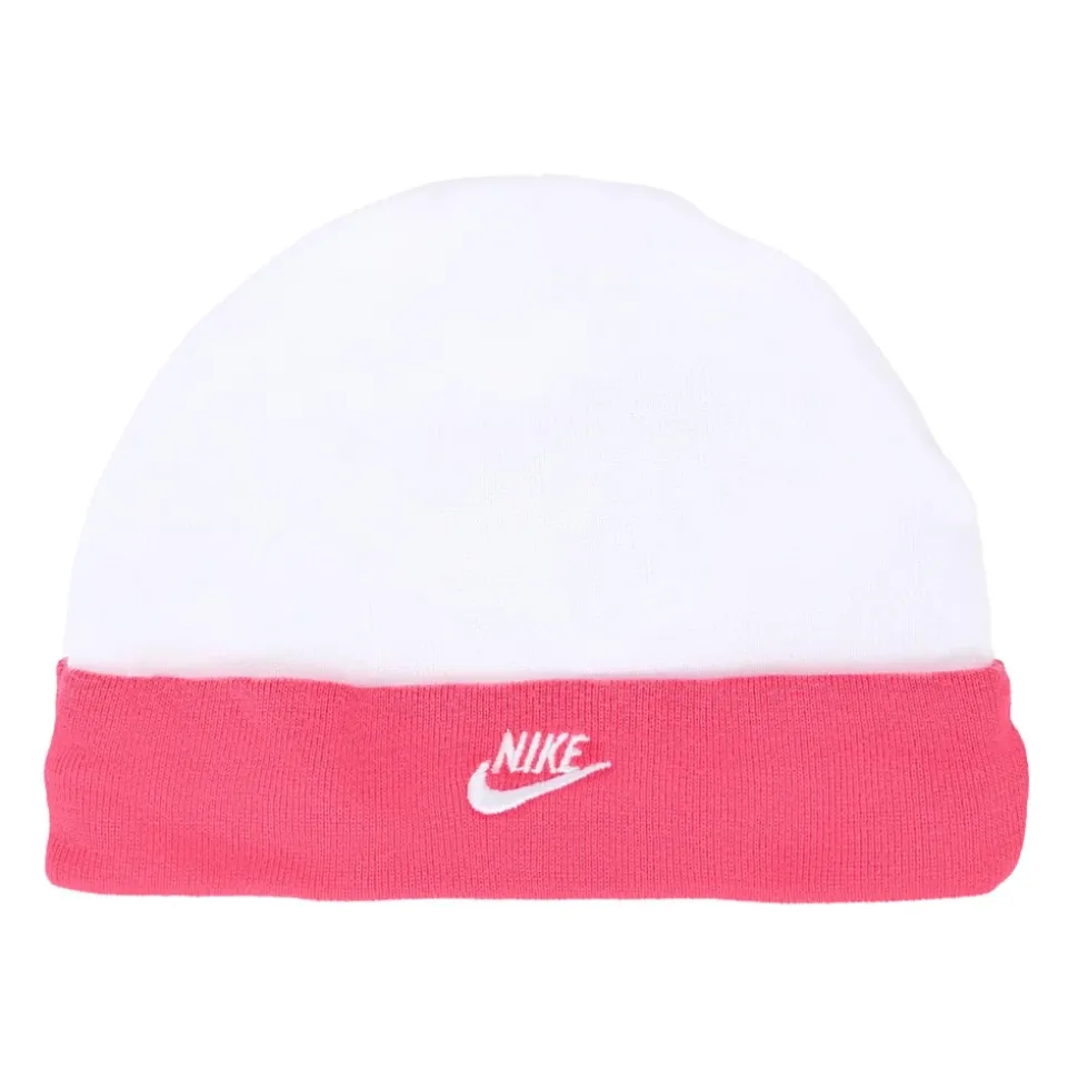 Kleed je kleintje in stijl met deze Nike witte katoenen set, inclusief een romper, muts en sokken. De romper heeft lange mouwen, een geribbelde ronde hals, drukknoopsluiting en een iconisch logo en swoosh op de voorkant. De muts en sokken hebben contrasterende fuchsia boorden en geborduurde swoosh-details. Gemaakt van 60% katoen en 40% polyester. Machinewas op 30°C.
