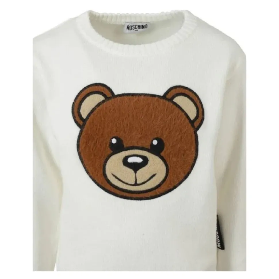 Blijf stijlvol en gezellig met deze witte gebreide trui van Moschino, perfect voor kinderen. Shop nu!