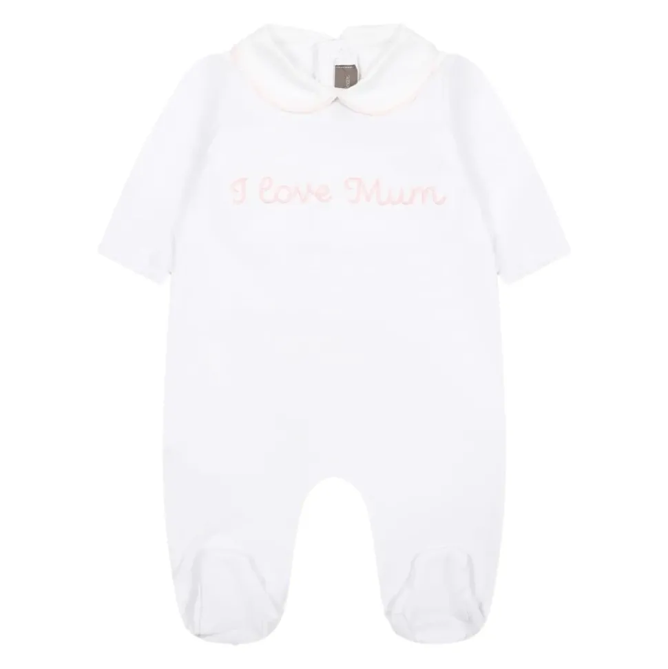 Little Bear witte stretch-katoenen pyjama voor kinderen, met geborduurde slogan, contrasterende afwerking, ronde kraag, drukknoopsluiting, lange mouwen en slofjes.