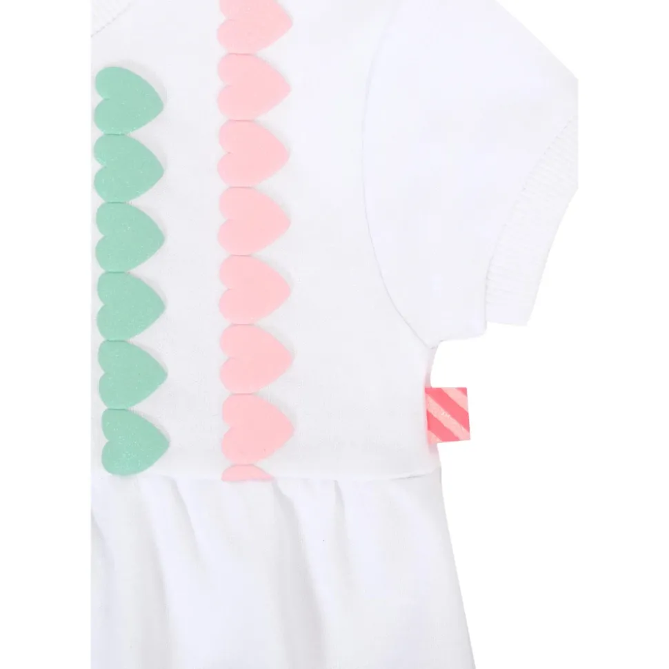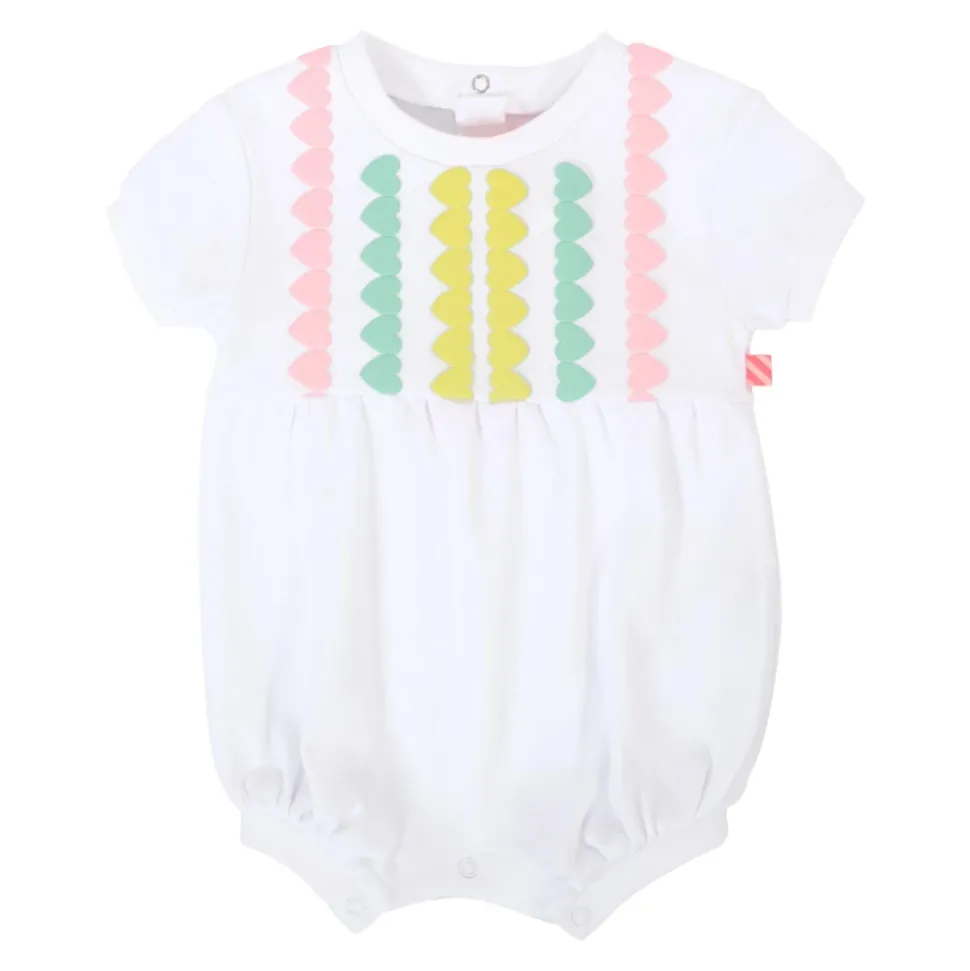 Kleed je kleine meisje in stijl met deze witte katoenen romper van Billieblush. Met korte mouwen, een ronde hals, drukknoopsluiting op de rug en tussen de benen, en versierd met lurex-harten aan de voorkant. Gemaakt van 100% katoen. Machinewas op 30C.