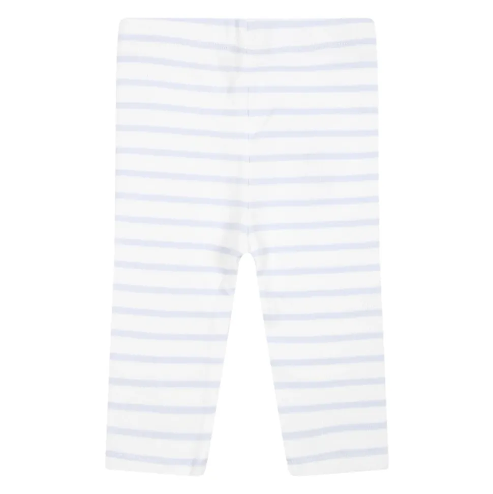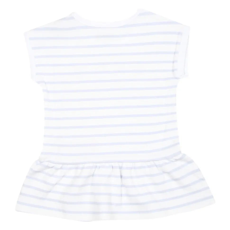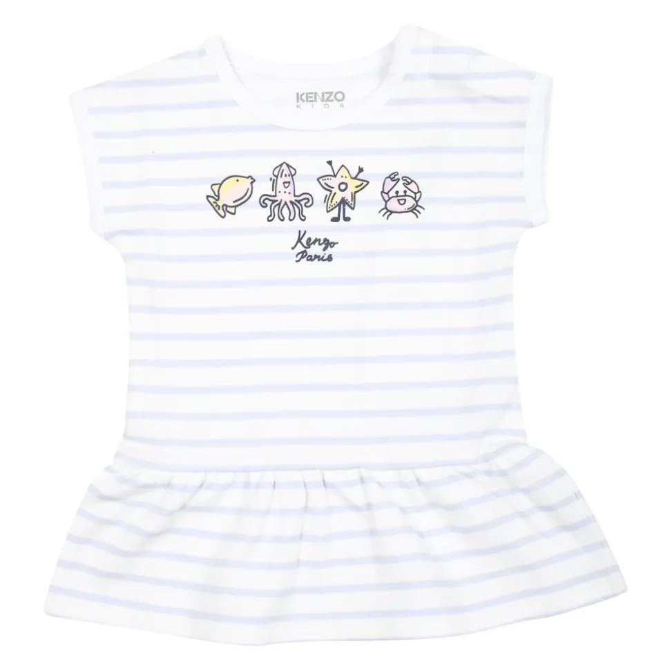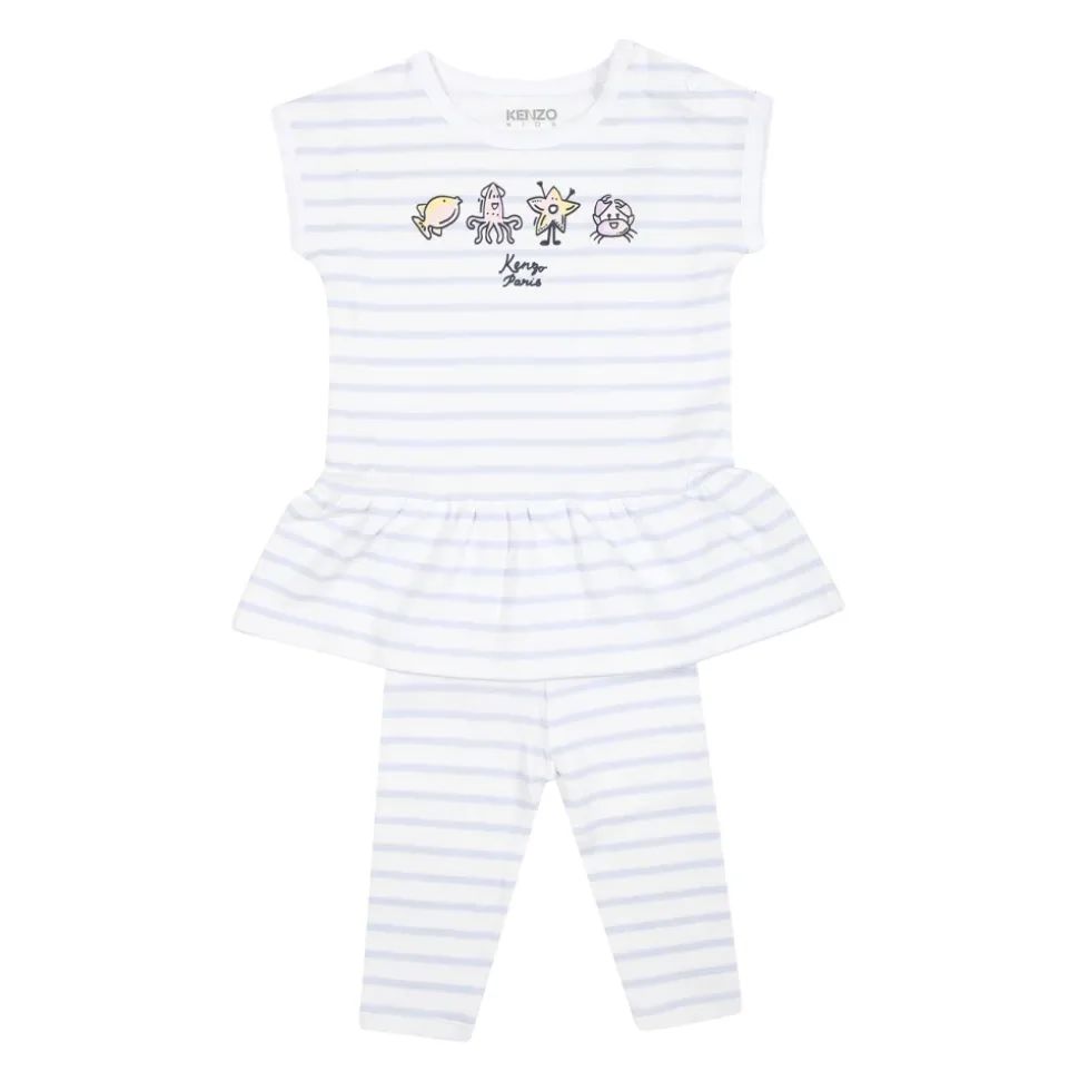 Kleed je kleine meisje in stijl met deze witte Kenzo sportpak set. De set bevat een katoenen jurk met korte mouwen, drukknoopsluiting, ronde hals en gerimpelde rok, versierd met hemelsblauwe strepen, zeedierenprints en het Kenzo-logo. De bijpassende witte katoenen leggings hebben een elastische taille en vergelijkbare versieringen. Gemaakt van 95% katoen en 5% polyamide. Machinewasbaar op 30°.