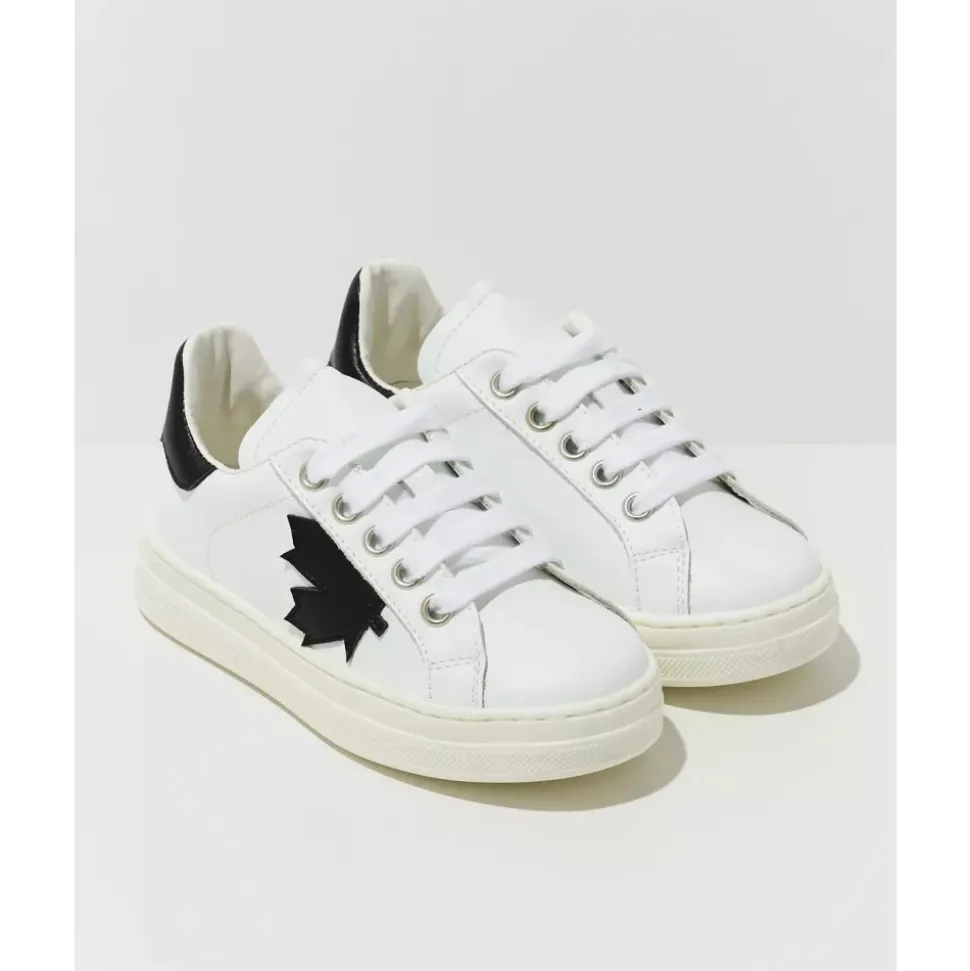 Stijlvolle witte sneakers van Dsquared2 Kids, met zwart merklogo aan de zijkanten. Klassiek vetersluiting met ronde neuzen, comfortabele gewatteerde binnenzool, witte rubberen zool en contrasterende zwarte hiel met Dsquared2 Kids logo. Gemaakt van hoogwaardig echt leer, geproduceerd in Italië. Zoolhoogte: 2 cm.