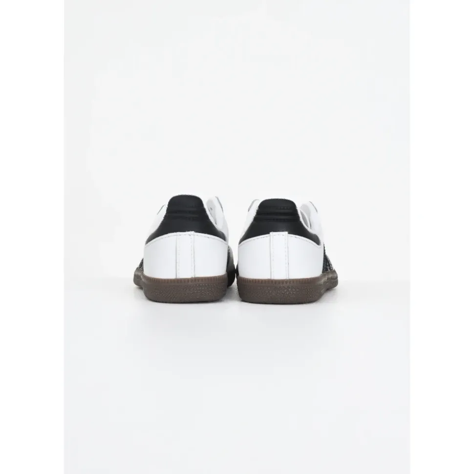 ADIDAS ORIGINALS Samba OG witte sneakers voor jongens en meisjes. De adidas Samba OG schoenen voor kinderen zijn een ware klassieker. Met een zachte leren bovenkant en de iconische suède T-teen, is de Samba OG al sinds de jaren 50 populair. Van voetbalvelden tot skateparken heeft deze schoen onderweg een legioen fans verzameld. Met een rubberen zool en gemakkelijk te dragen kleuren en materialen, hebben deze schoenen een tijdloze maar moderne uitstraling. De glanzende lakleren 3 strepen geven ze een unieke afwerking. Herfst winter seizoen. Lage profiel witte sneakers voor kinderen. Materiaal: Leer en rubber.