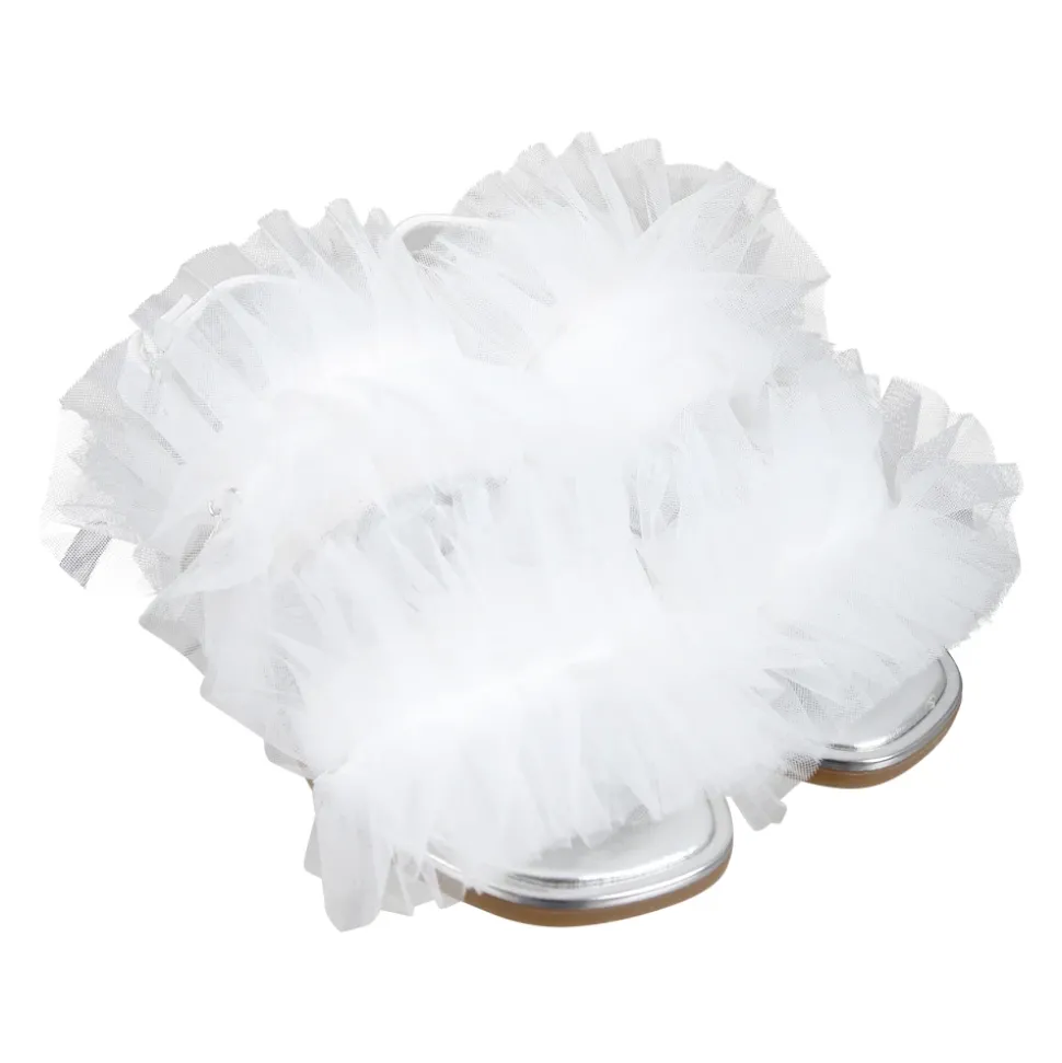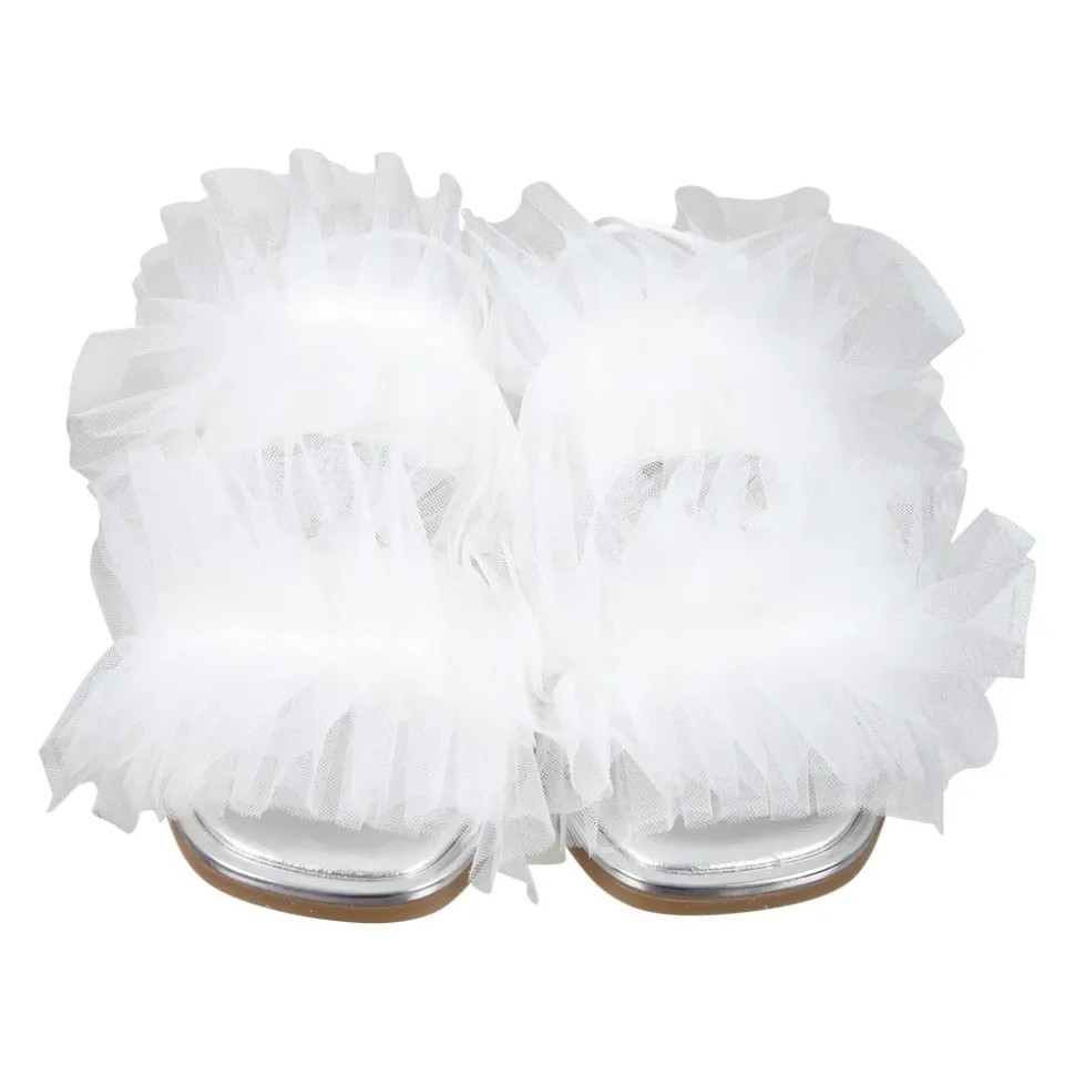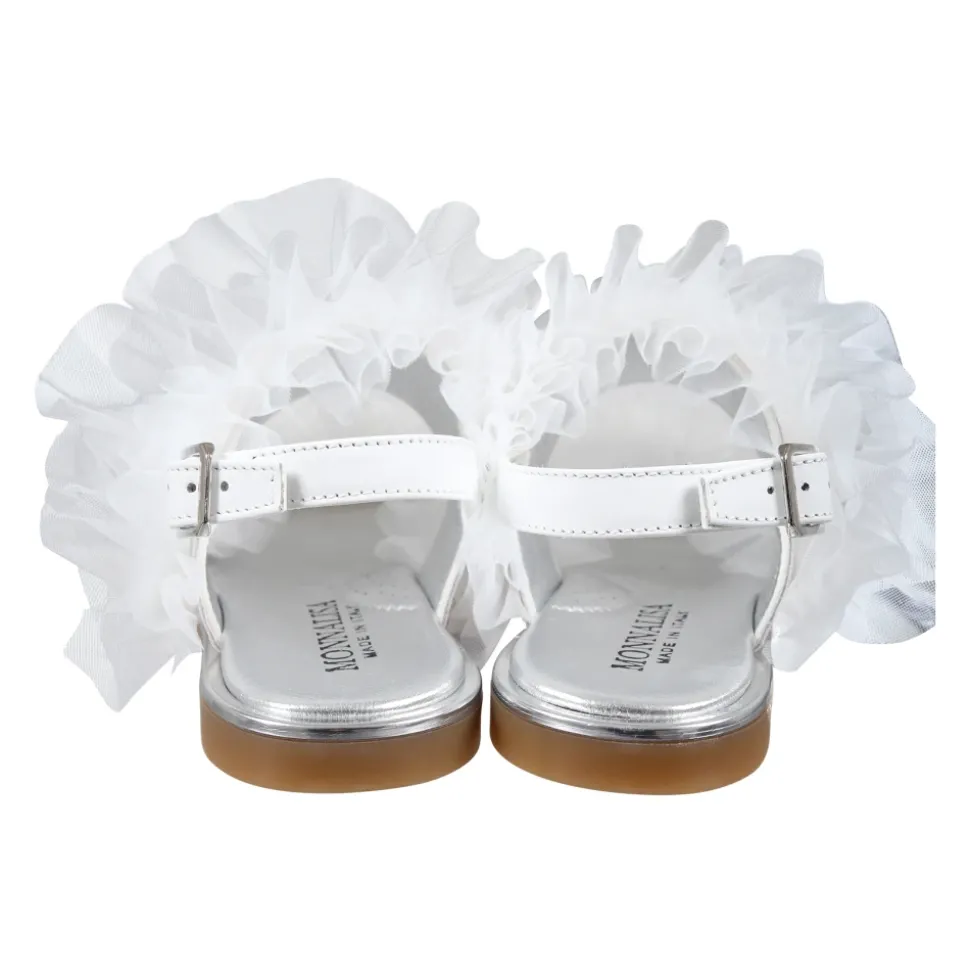 Monnalisa witte sandalen voor meisjes met verstelbare sluiting, platte zool, zachte zilveren binnenzool. Versierd met tule strik en zilveren bedel in de vorm van een hart met logo.