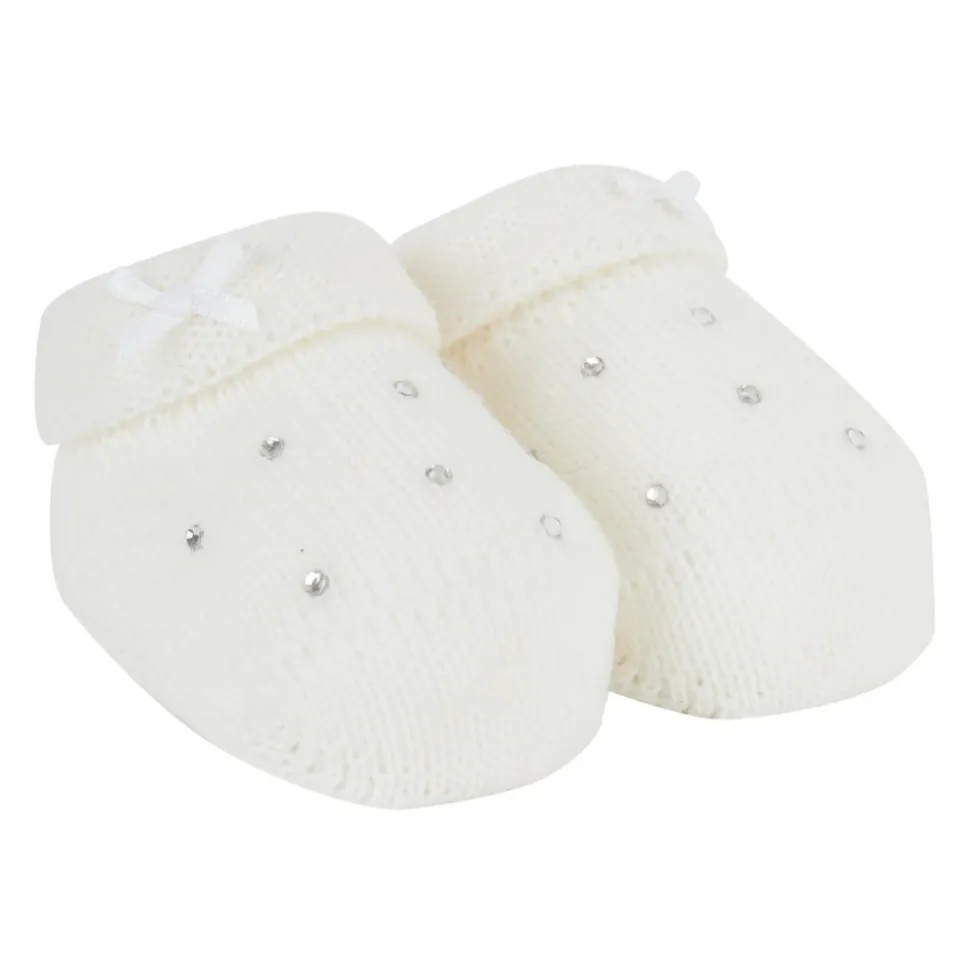 GALLO Kinder booty sokken gemaakt in Italië van zacht wolblendstof. Een vleugje onmiskenbare originaliteit, zelfs voor de kleintjes. De lichte witte kleur is gemakkelijk te combineren met elke romper. Versierd met kleine strass-steentjes en een strik. Houdt de kleintjes warm, zelfs op de koudste dagen. Gallo: belichaamt kwaliteit sinds 1927.