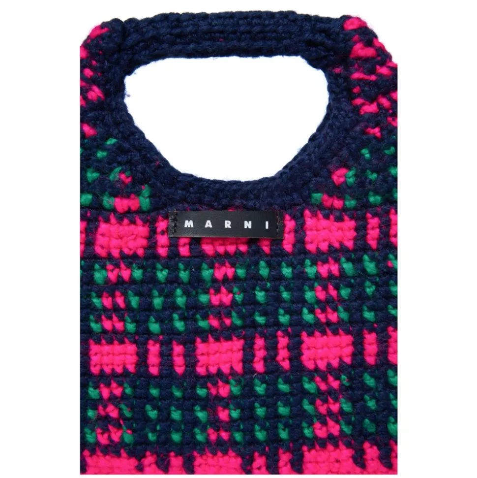 De Marni Wooly Crochet Check Tas is een stijlvol handaccessoire met een uniek gehaakt check-design en een institutionele logopatch, perfect voor speciale gelegenheden. Belangrijkste kenmerken: Fuxia | Multicolor | Acryl | Gehaakte check constructie | Handtas design | Institutionele logopatch | Afmetingen en pasvorm: 15 cm hoogte | 25 cm totale hoogte | 25 cm breedte | Handvat drop: 7 cm | Samenstelling en onderhoud: 100% Acryl | Applicatie: 100% Rundleer