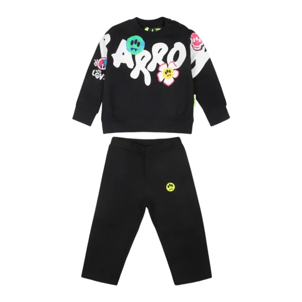 Kleed je kleine meisje in stijl met de BARROW zwarte set, bestaande uit een gezellige trui en bijpassende leggings. De trui is gemaakt van zacht katoen en heeft lange mouwen, een geribbelde ronde hals en drukknopen op de schouder voor gemakkelijk aan- en uitkleden. Geribde manchetten en zoom zorgen voor extra comfort en een goede pasvorm. Versierd met een logoprint, een glimlach en een vredessymbool op de voorkant en mouwen, voegt deze set een speels en onderscheidend tintje toe aan haar garderobe.