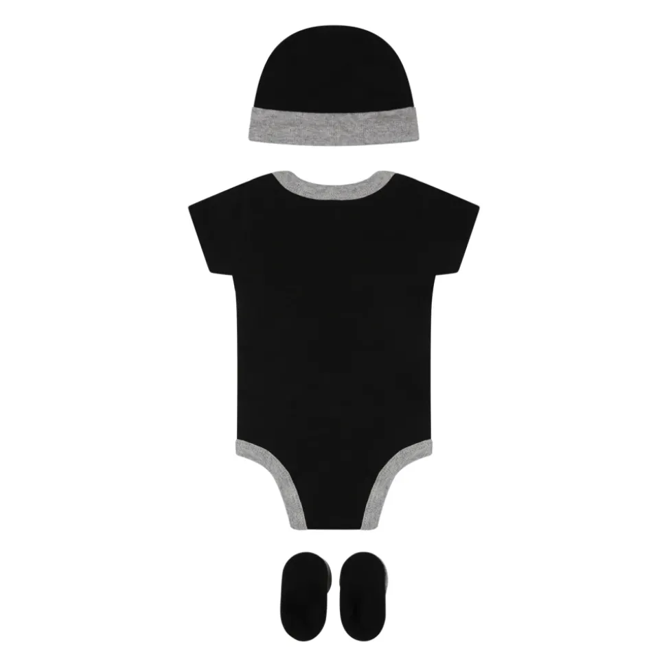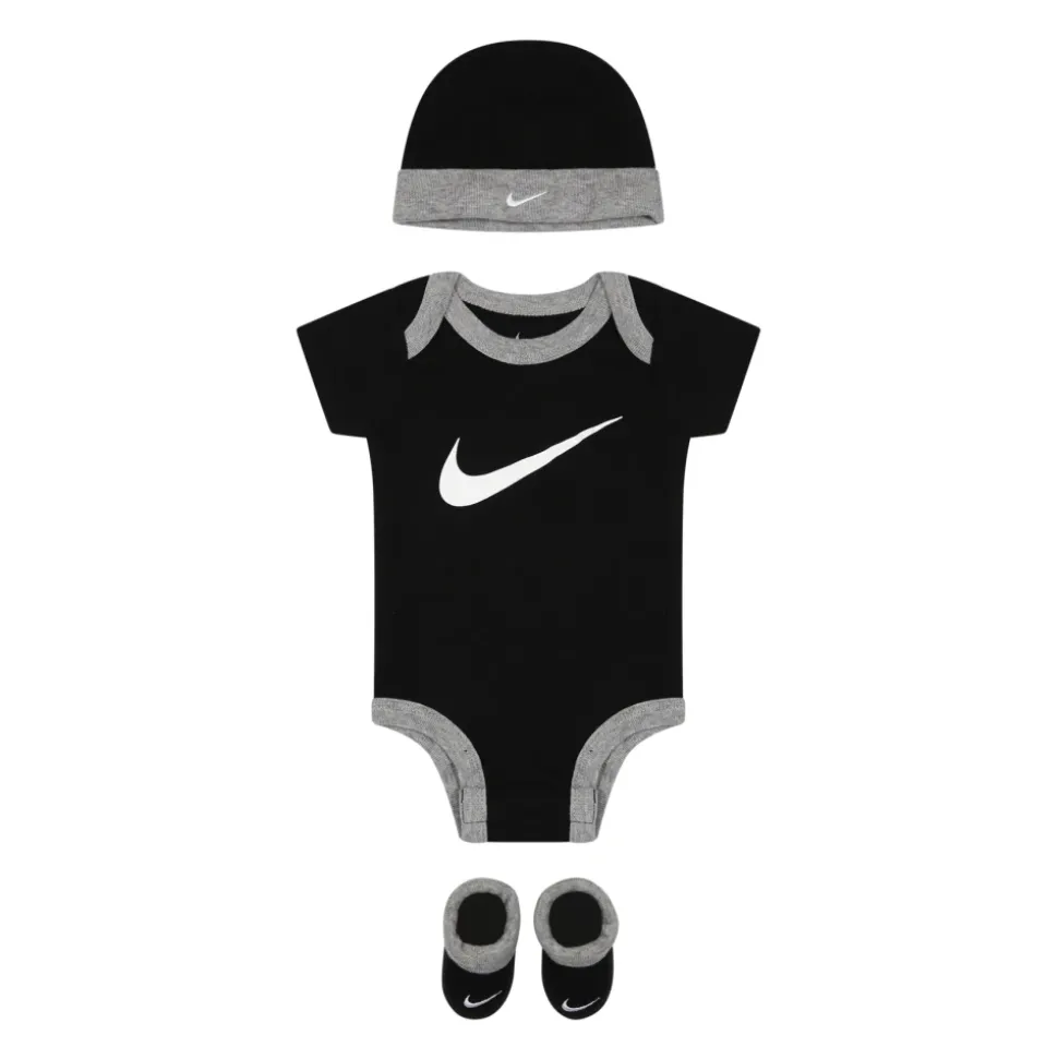 Kleed je kleintje in stijl met deze zwarte Nike set. Gemaakt van 100% katoen, de set bevat een romper, muts en sokken. De romper heeft korte mouwen, een geribbelde ronde hals, drukknoopsluiting tussen de benen en het iconische swoosh logo aan de voorkant. De muts en sokken hebben een contrasterende grijze boord, beide versierd met het geborduurde swoosh logo. Machinewasbaar op 30°C.