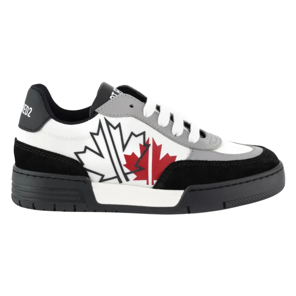 DSQUARED2 Kinderen leren sneakers in zwart/wit, met een rond neusontwerp, voorzijde vetersluiting, rode contrastdetails, logo opdruk aan de achterkant, bedrukte tong, suède leren delen, rubberen zool en leren binnenzool. Gemaakt in Italië.