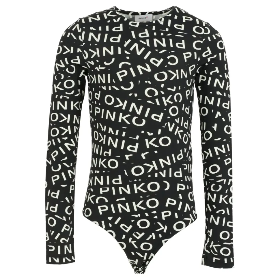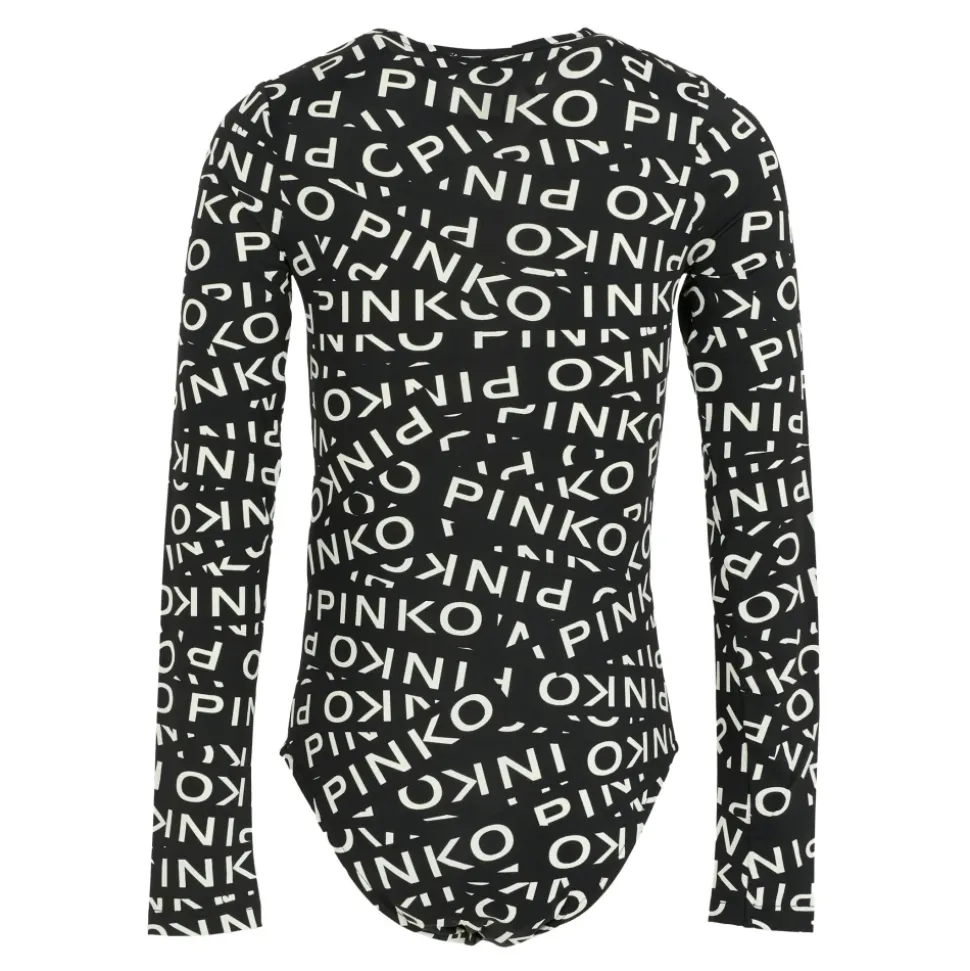 Kleed je kleine meisje in stijl met deze PINKO zwarte body met lange mouwen, een ronde halslijn en drukknopen tussen de benen. Versierd met een all-over wit logo print. Gemaakt van 80% polyamide en 20% elastaan. Machinewas op 30°C.