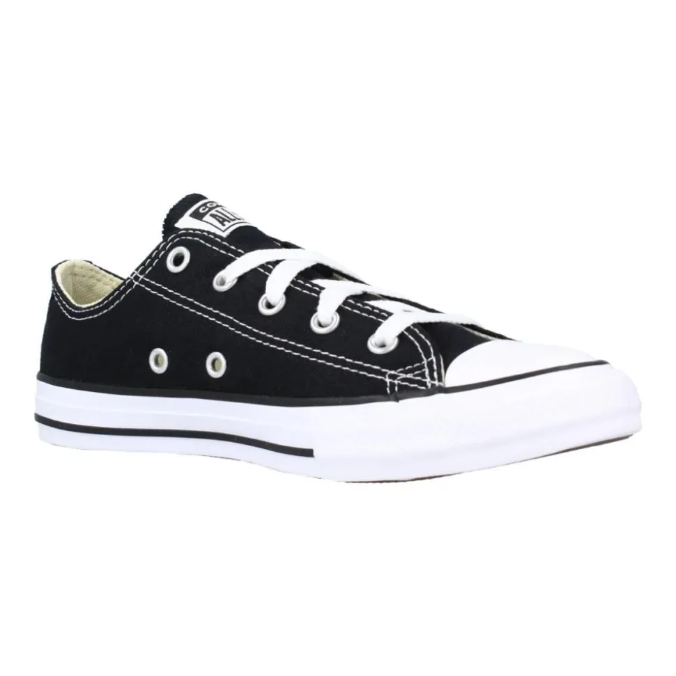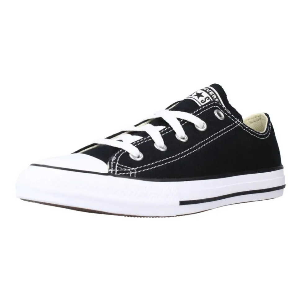 Converse Kids All Star OX Sneakers in het zwart. Canvas buitenkant met vetersluiting en rubberen neus. Textiel interieur. Rubberen zool met zwarte rand en logo detail aan de achterkant.
