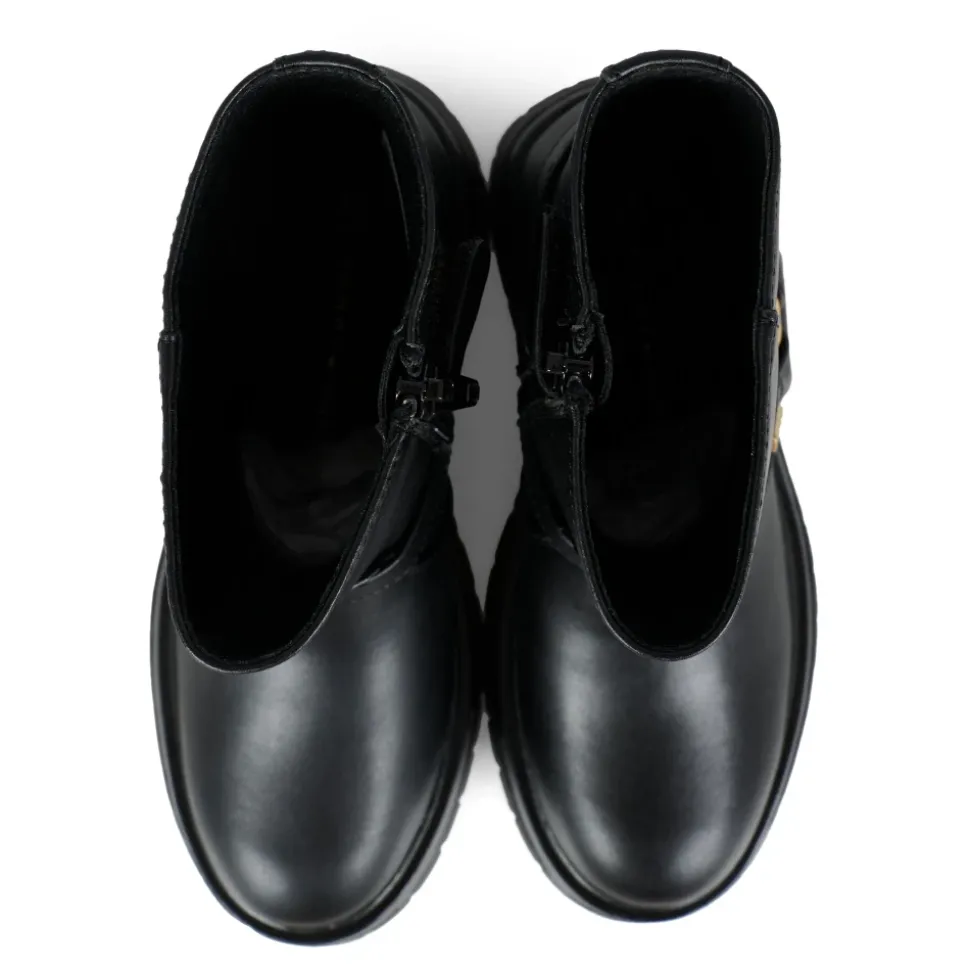 Upgrade de stijl van je kind met deze zwarte enkellaarsjes van imitatieleer van Tommy Hilfiger. Voorzien van rubberen zolen, zijrits, metalen details en een ronde neus, zijn deze laarsjes versierd met een metalen logo aan de zijkant. Gemaakt van 100% synthetische materialen.