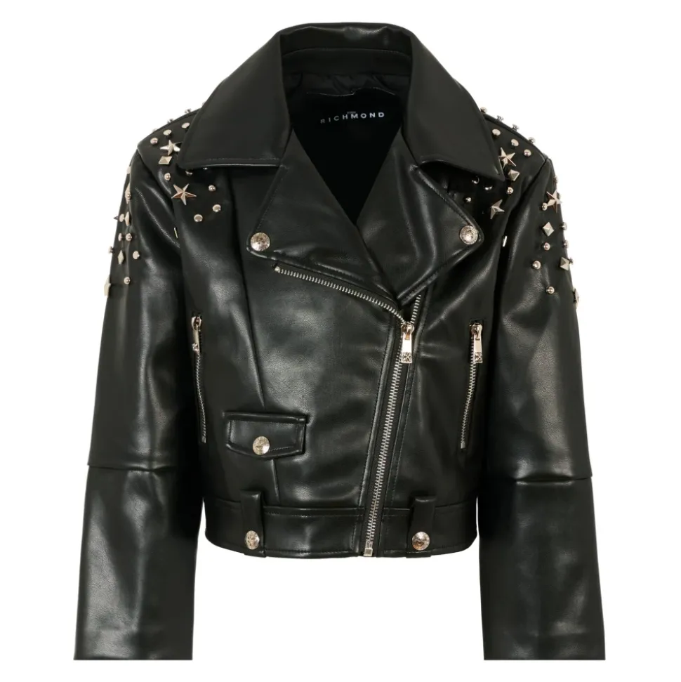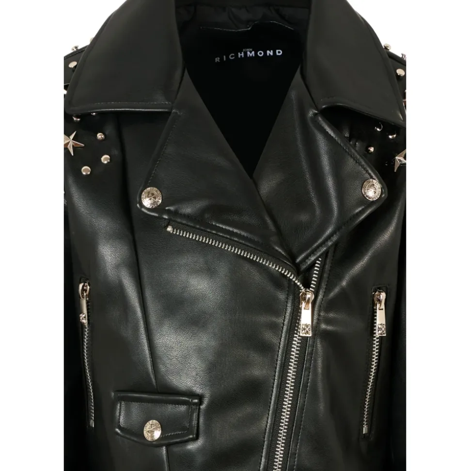 Upgrade de stijl van je kind met deze zwarte imitatieleren jas van John Richmond. Met lange mouwen, een reverskraag, een ritssluiting aan de voorkant en zijzakken met ritssluiting. Versierd met sterren en studs op de schouders en mouwen. Gemaakt van 45% polyurethaan en 55% polyester. Alleen chemisch reinigen.