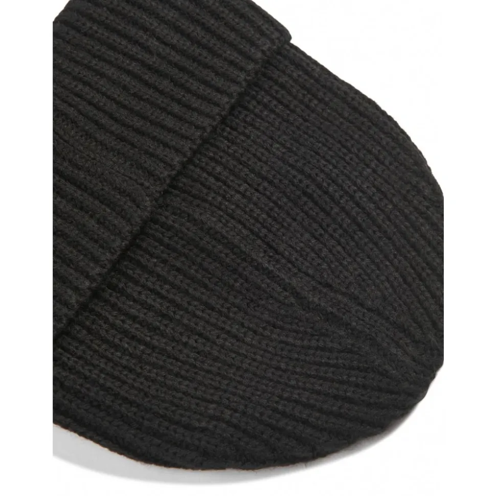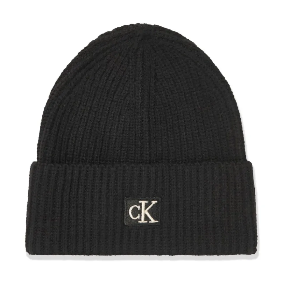Calvin Klein Jeans zwarte geribbelde gebreide muts voor jongens met omgeslagen rand, logopatch aan de voorkant, naaddetails en pull-on stijl.