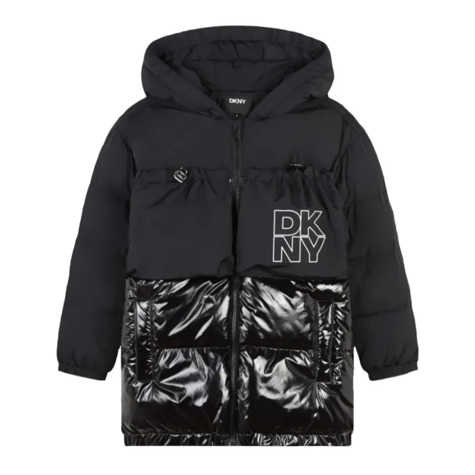 Deze DKNY-jas is gemaakt van 100% polyamidestof. Met een modern en tijdloos ontwerp is deze jas perfect om elke look aan te vullen, of het nu casual of meer formeel is. De gewatteerde voering biedt uitstekende bescherming tegen het weer zonder extra volume toe te voegen, waardoor meisjes comfortabel en warm blijven. Het subtiele DKNY-logo verschijnt aan de voorkant en voegt de kenmerkende touch van het merk toe. De jas heeft een ritssluiting voor eenvoudig gebruik en zorgt voor een nauwsluitende pasvorm die beschermt tegen de wind. Het heeft een capuchon, perfect voor lichte regen of windbescherming, evenals twee voorzakken op de borst.